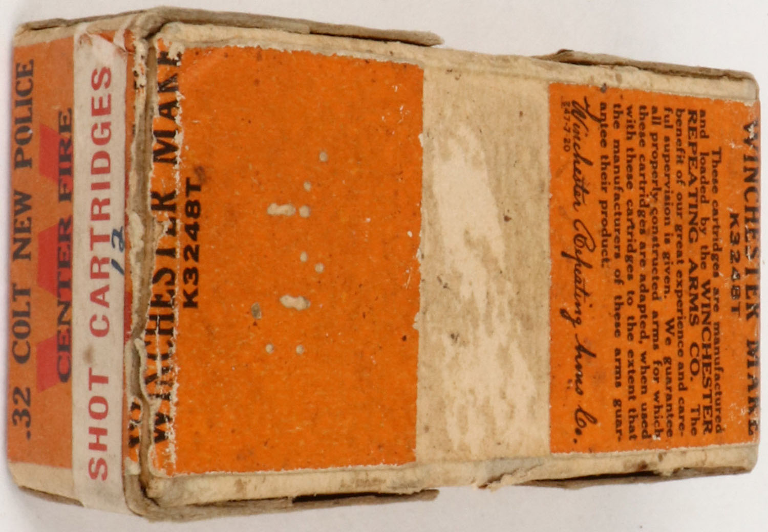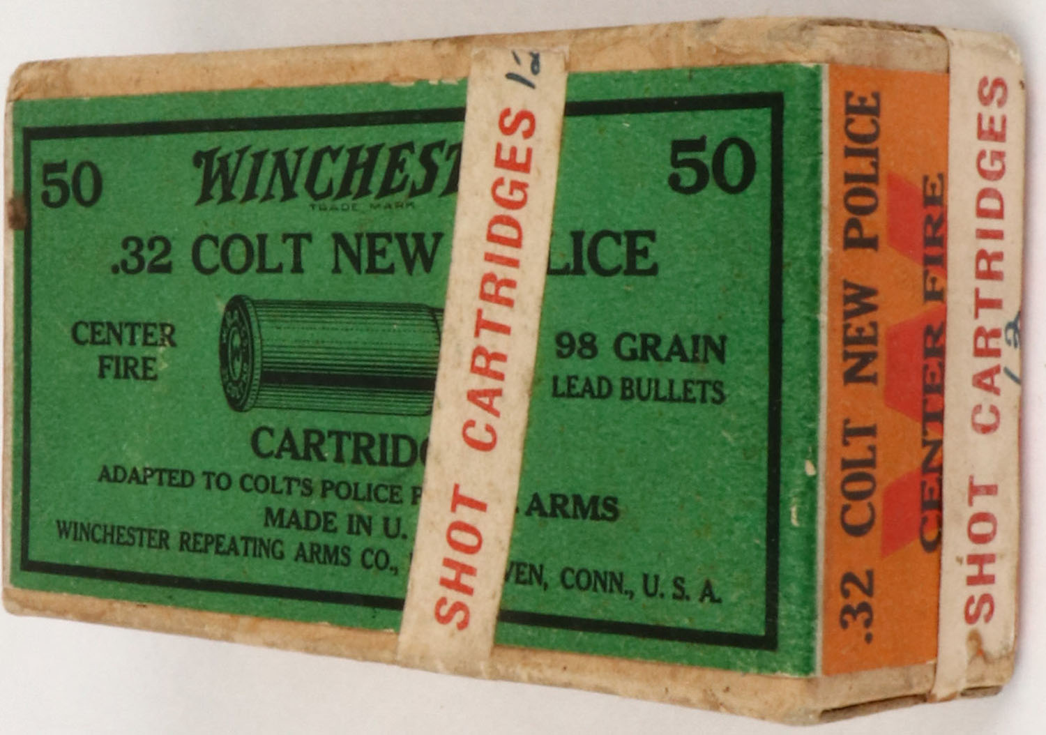 Winchester, .32 Colt New Police SHOT CARTRIDGES, Center Fire, Full, 2pc. Buff box with green & orange wraparound label with ''SHOT CARTRIDGES'' over labels, box is solid with excellent color, very minor age soiling, some staining to front, very minor edge & corner wear, labels are intact, ammo is excellent. Grade: Excellent + - Value: 20 to 200