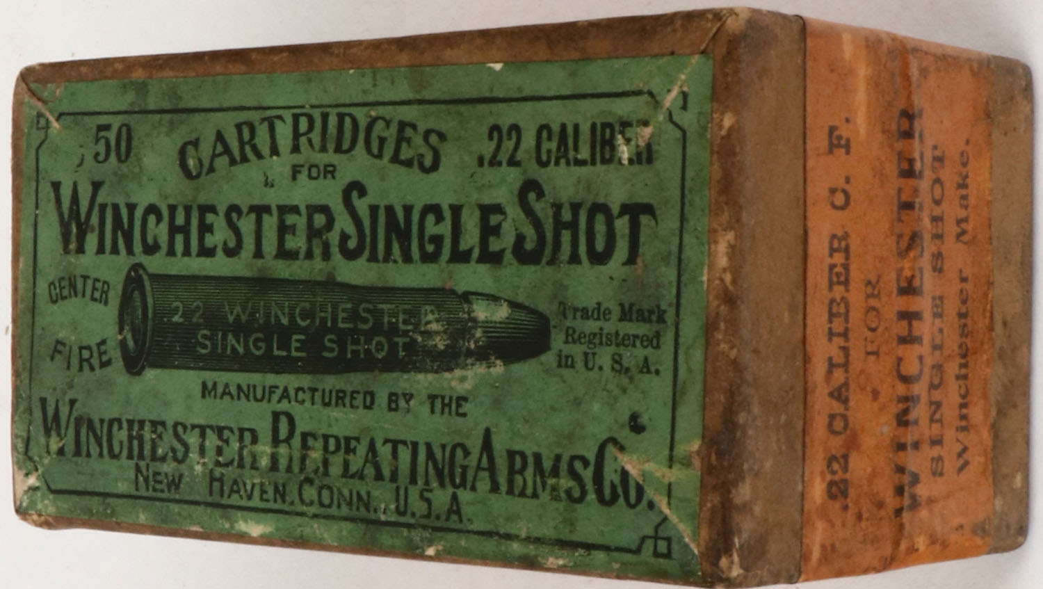 Winchester, Single Shot, .22 Caliber Center Fire, FULL & SEALED, 2pc. Buff box with green top & orange side sealing labels, box is solid with very good to excellent color, age soiling, very minor corner wear, edges are crisp, labels are intact. Grade: Excellent - Value: 50 to 250