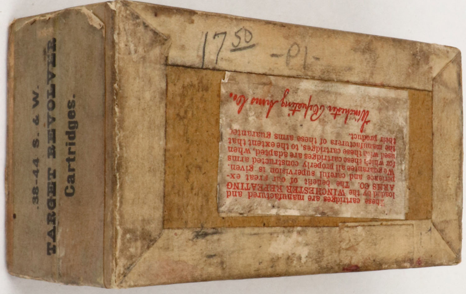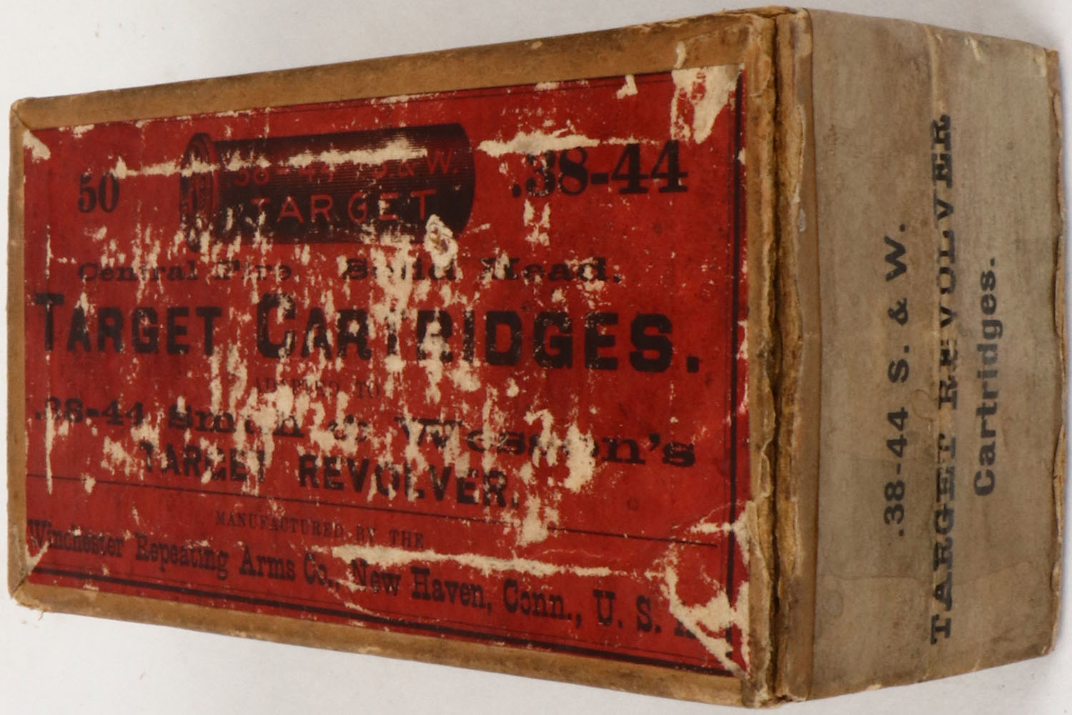 Winchester, .38-44 Smith & Wesson Target Cartridges, FULL & SEALED, 2pc. Buff box with red top & buff side sealing labels, box is solid with very good color, shelf wear, age soiling, very minor edge & corner wear, labels are intact. (907) Grade: Very Good ++ - Value: 50 to 200