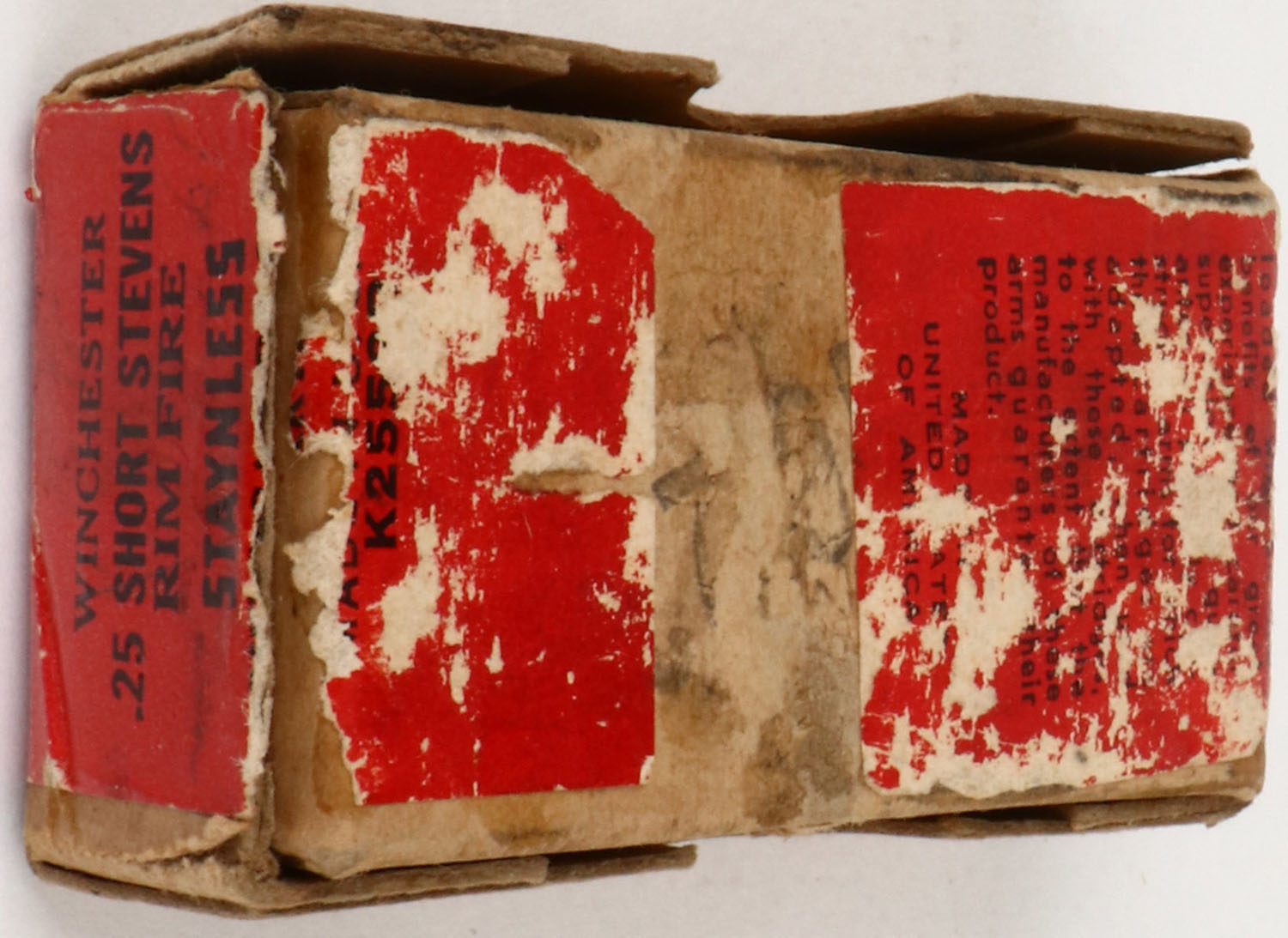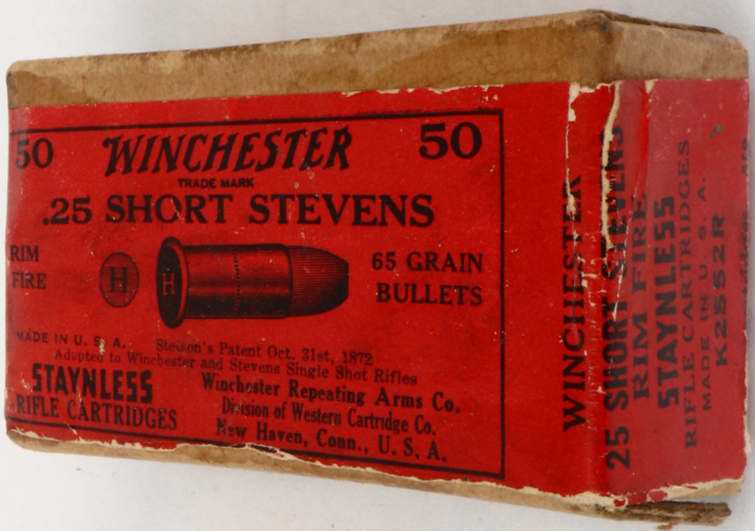 Winchester, .25 Short Stevens Rim Fire, 65 Grain Bullets, Partial 43rds. 2pc. Buff box with red wraparound label, box is solid with excellent color, very minor age soiling & shelf wear, 2 seam splits on front corners of lid, scuffing on bottom, labels are 99% intact, ammo is very good to excellent. Grade: Very Good - Value: 30 to 120
