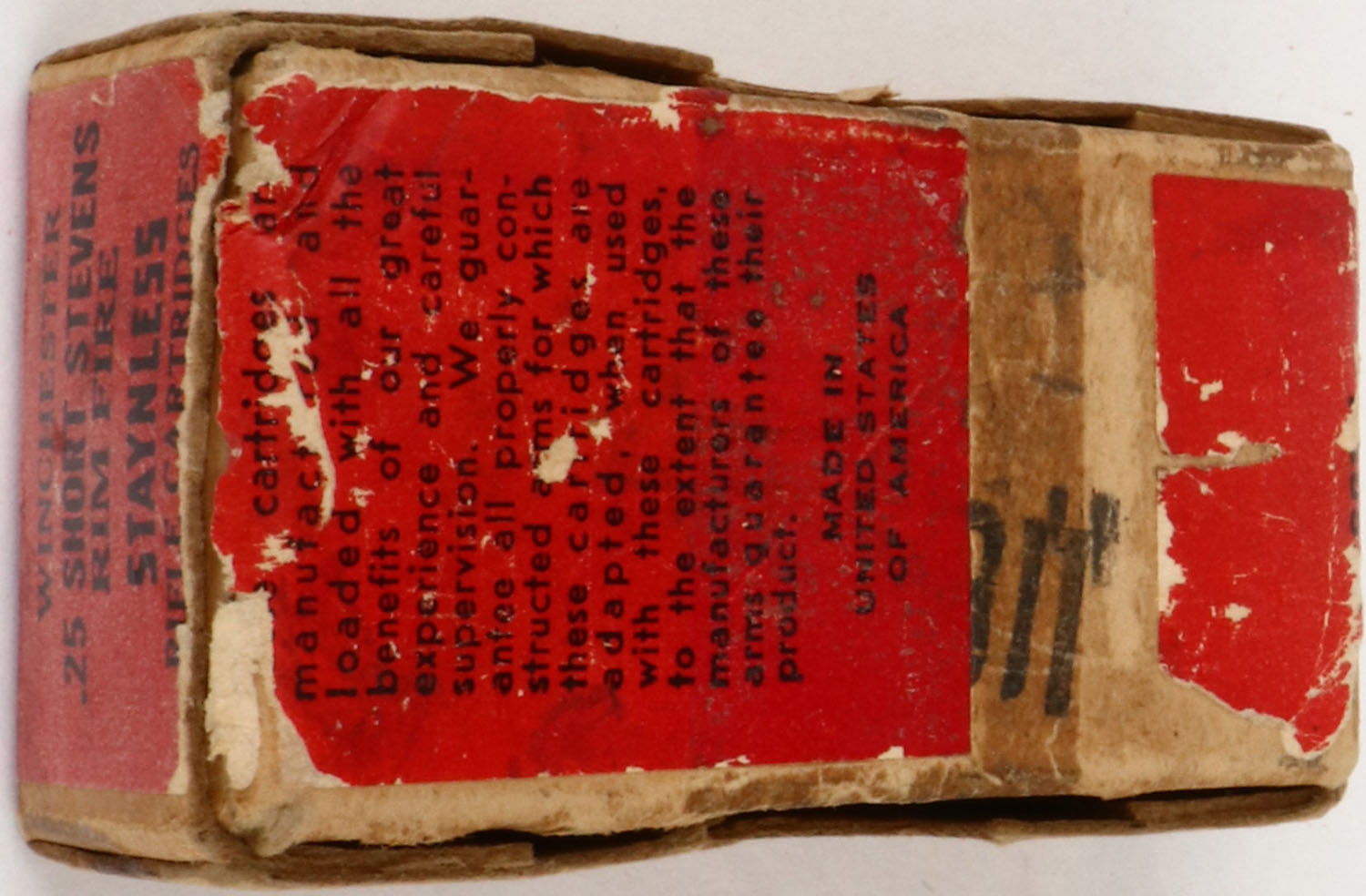 Winchester, .25 Short Stevens Rim Fire, 65 Grain Bullets, Full, 2pc. Buff box with red wraparound label, box is solid with excellent color, shelf wear, minor age soiling, very minor edge & corner wear, labels are 98% intact, ammo is excellent. Grade: Very Good ++ - Value: 50 to 150