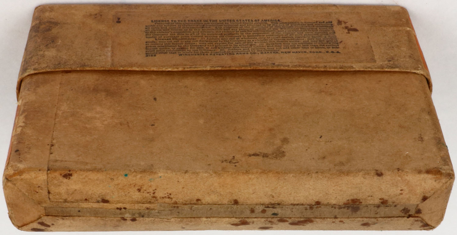 Winchester, .35 Caliber Soft Point, Model 1895, Partial 17rds., 2pc. Buff box with orange labels, box is solid with very good to excellent color, age soiling, some staining to bottom, labels are 99% intact, ammo is fair. (1022) Grade: Very Good ++ - Value: 20 to 80