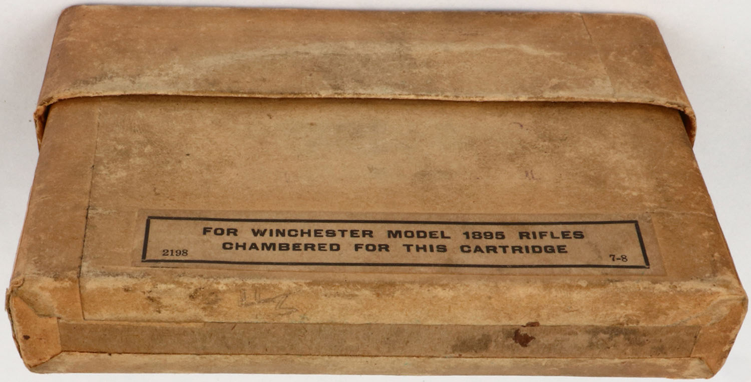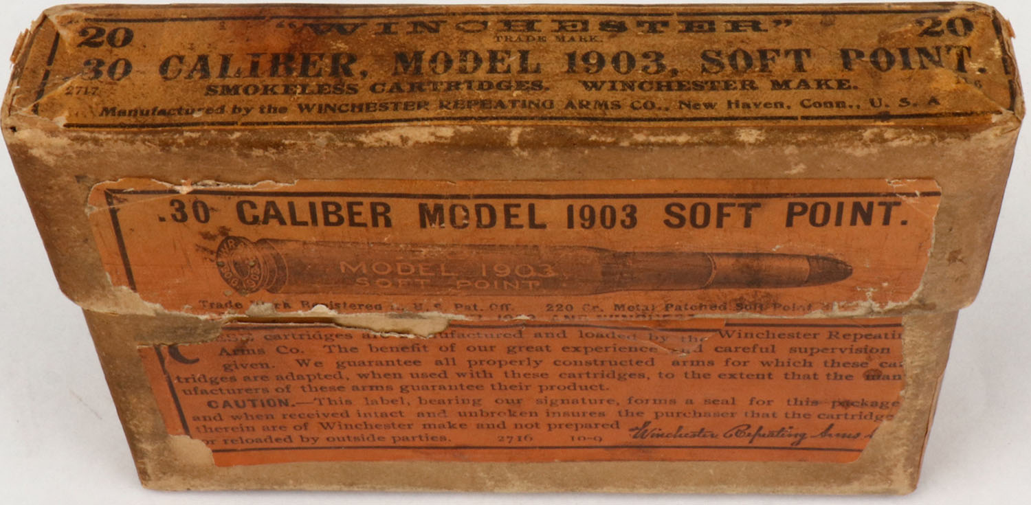 Winchester, .30 Caliber Model 1903 Soft Point, 220 Gr. Metal Patched Soft Point Bullets, Partial 18rds. Correct, 2pc. Buff box with orange labels, box is solid with very good color, age soiling, shelf wear, some edge wear, left end has been written on, labels are 98% intact, ammo is very good. (1462) Grade: Excellent - Value: 20 to 80