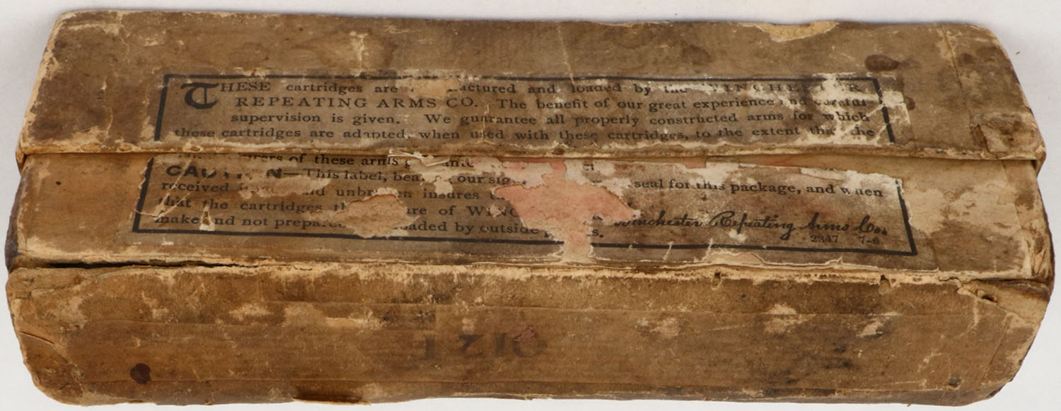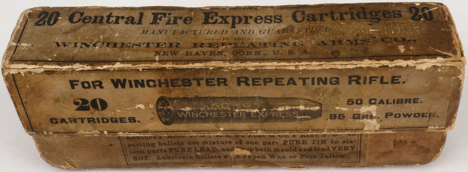 Winchester, 50-95, 20 Central Fire Express Cartridges, For Winchester Repeating Rifle, 2pc., Full, Buff box with black printing,, box has seam split on bottom right end from front to back, seam split on front of lid has been glued from the inside, age soiling, edge wear, ammo is excellent. Grade: Very Good - Value: 800 to 1600
