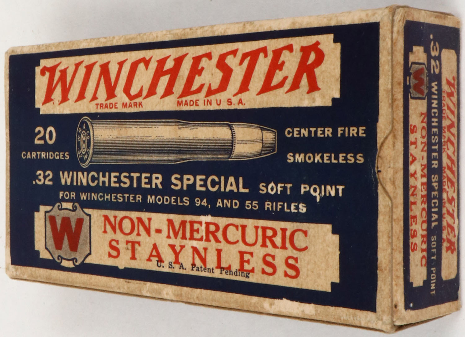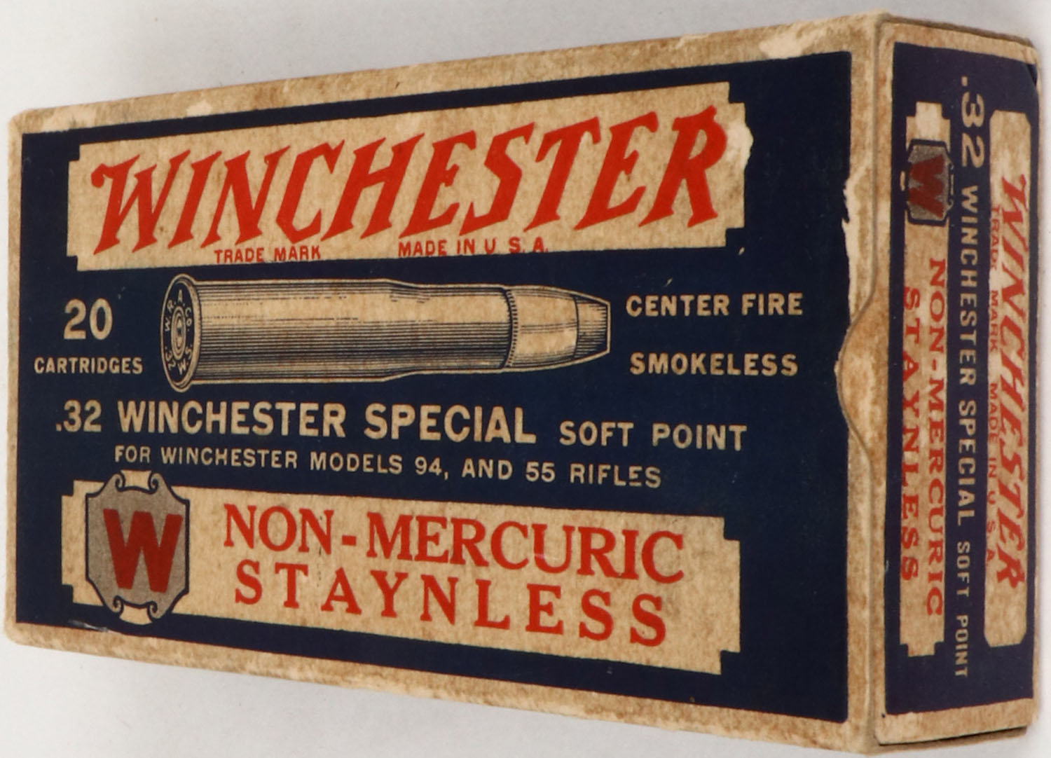 Winchester, Non-Mercuric Staynless, .32 Winchester Special, Soft Point, Full, 1pc. Blue white & red box, box is solid with excellent color, some age soiling, very minor corner wear, edges are mostly crisp, end flaps are solid, ammo is very good to excellent. Grade: Excellent - Value: 100 to 300