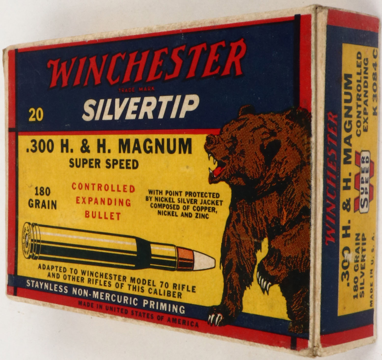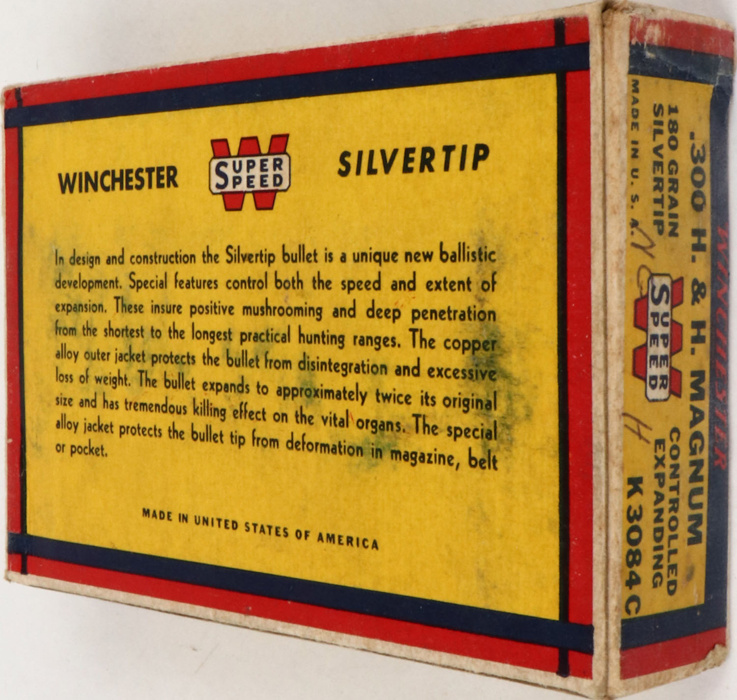 Winchester, Silvertip, .300 H&H Magnum, 180 Grain, Full, 1pc. Yellow blue & red Bear Box, box is solid with excellent color, very minor age soiling, some corner wear, small tear to left end flap, edges are somewhat crisp, end flaps are solid, ammo is very good to excellent. (776) Grade: Excellent - Value: 30 to 90