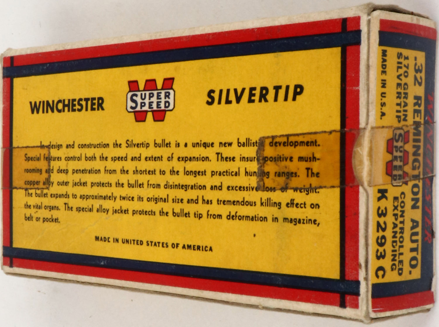 Winchester, Silvertip, .32 Remington Autoloading, 170 Grain Controlled Expanding Bullet, Full, 1pc. Yellow blue & red Bear Box, box is solid with excellent color, very minor age soiling, tape on both end flaps, top has been written on, some corner wear, very minor edge wear, end flaps are solid, ammo is excellent. Grade: Very Good ++ - Value: 20 to 80