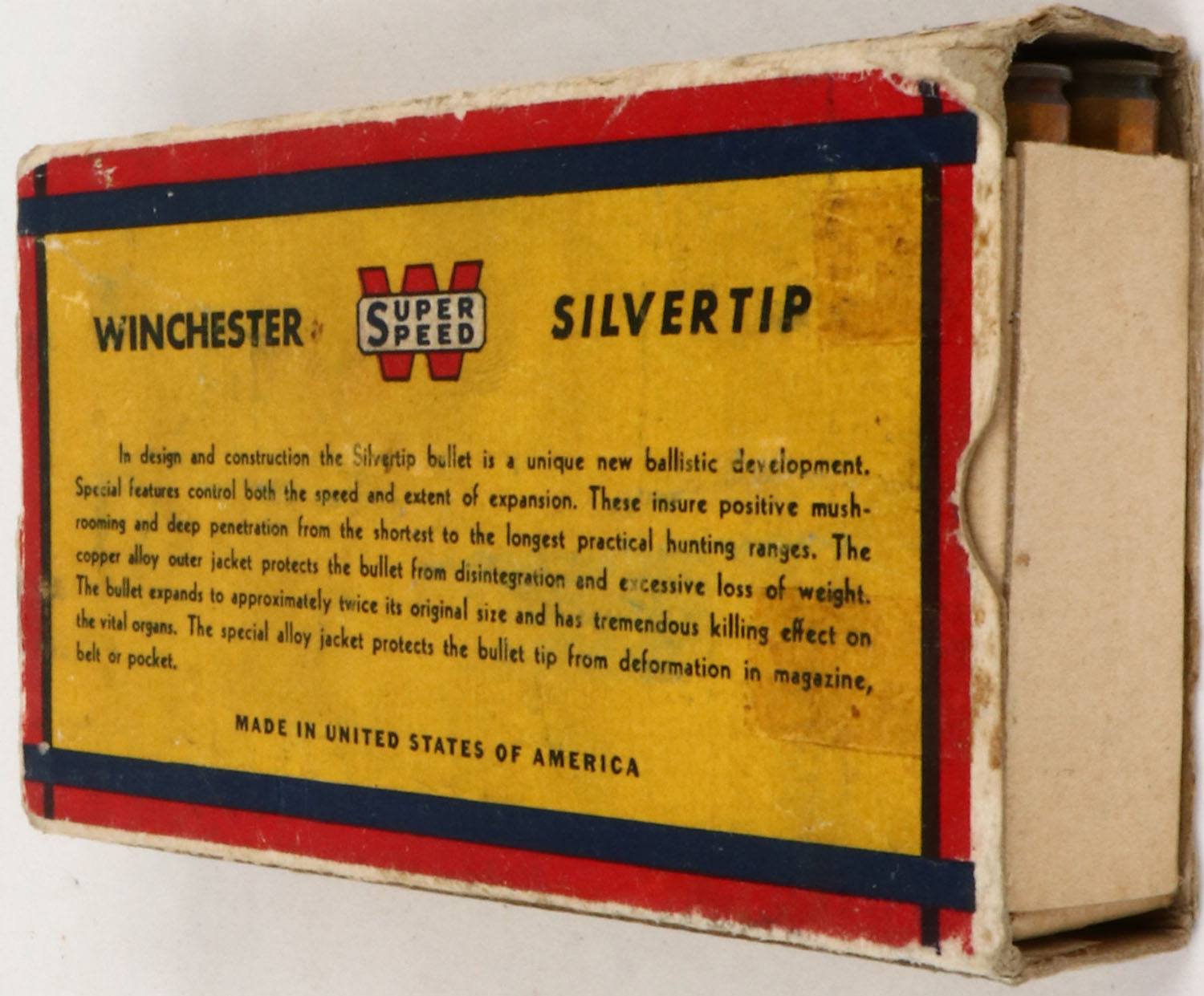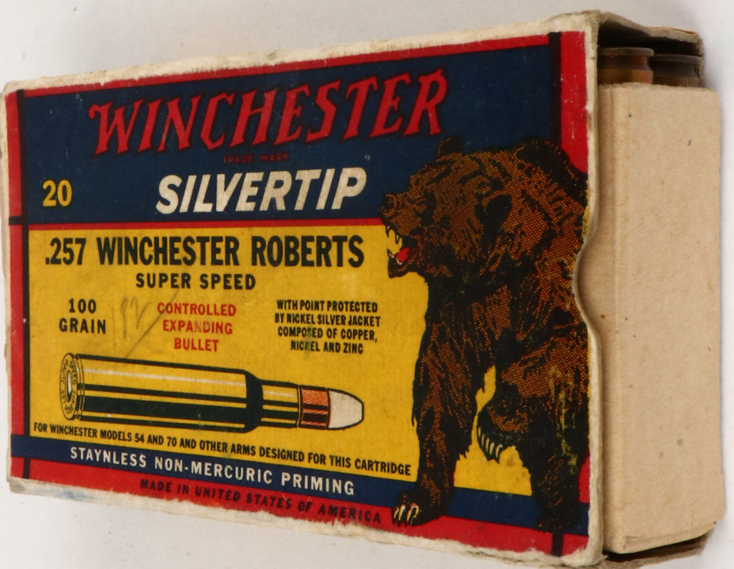 Winchester, Silvertip, .257 Winchester Roberts, 100 Grain Controlled Expanding Bullet, Full, 1pc. Yellow blue & red Bear Box, box is missing both end flaps with excellent color, minor age soiling, some edge & corner wear, top has been written on, ammo is excellent. Grade: Very Good + - Value: 20 to 100