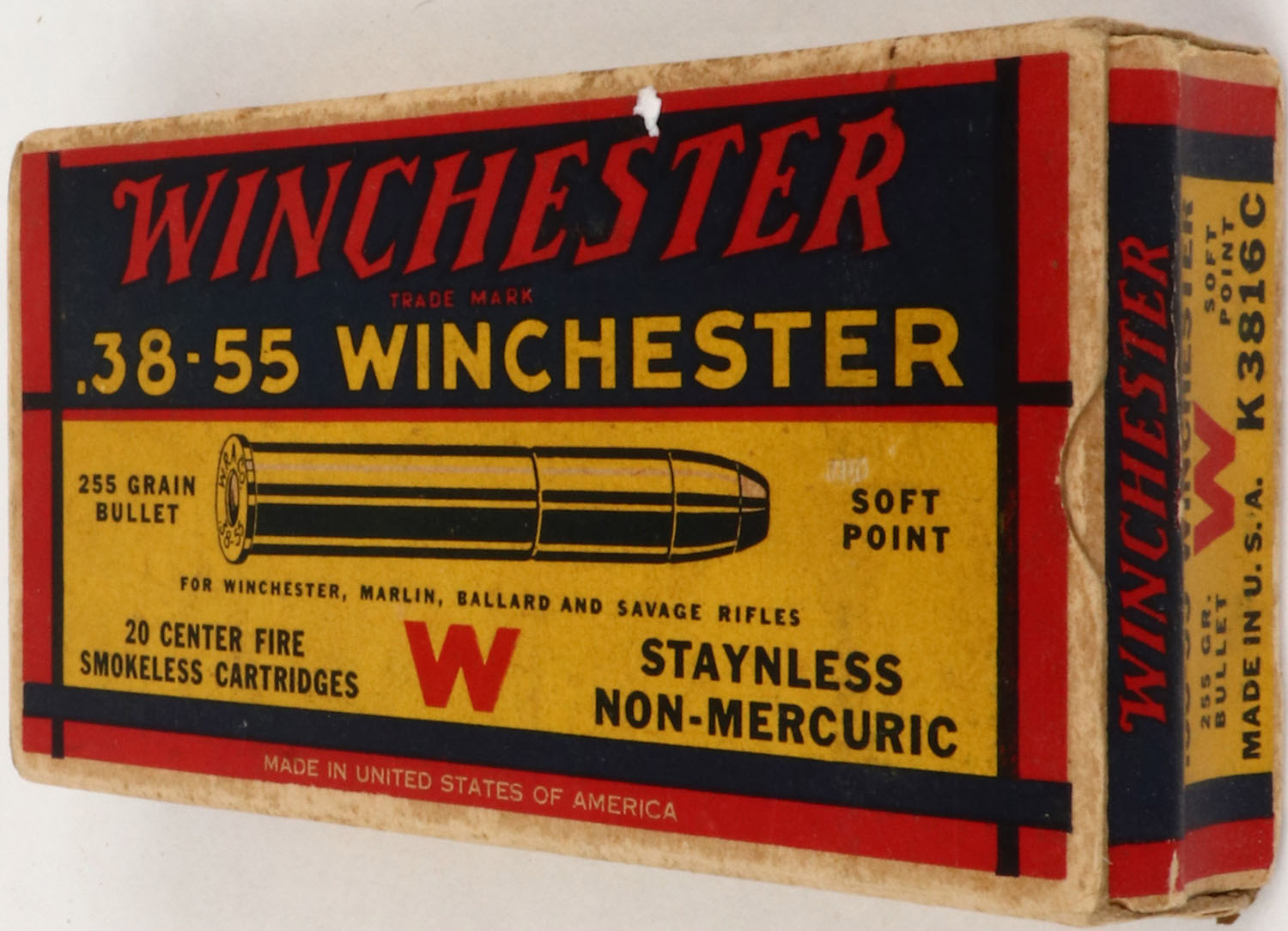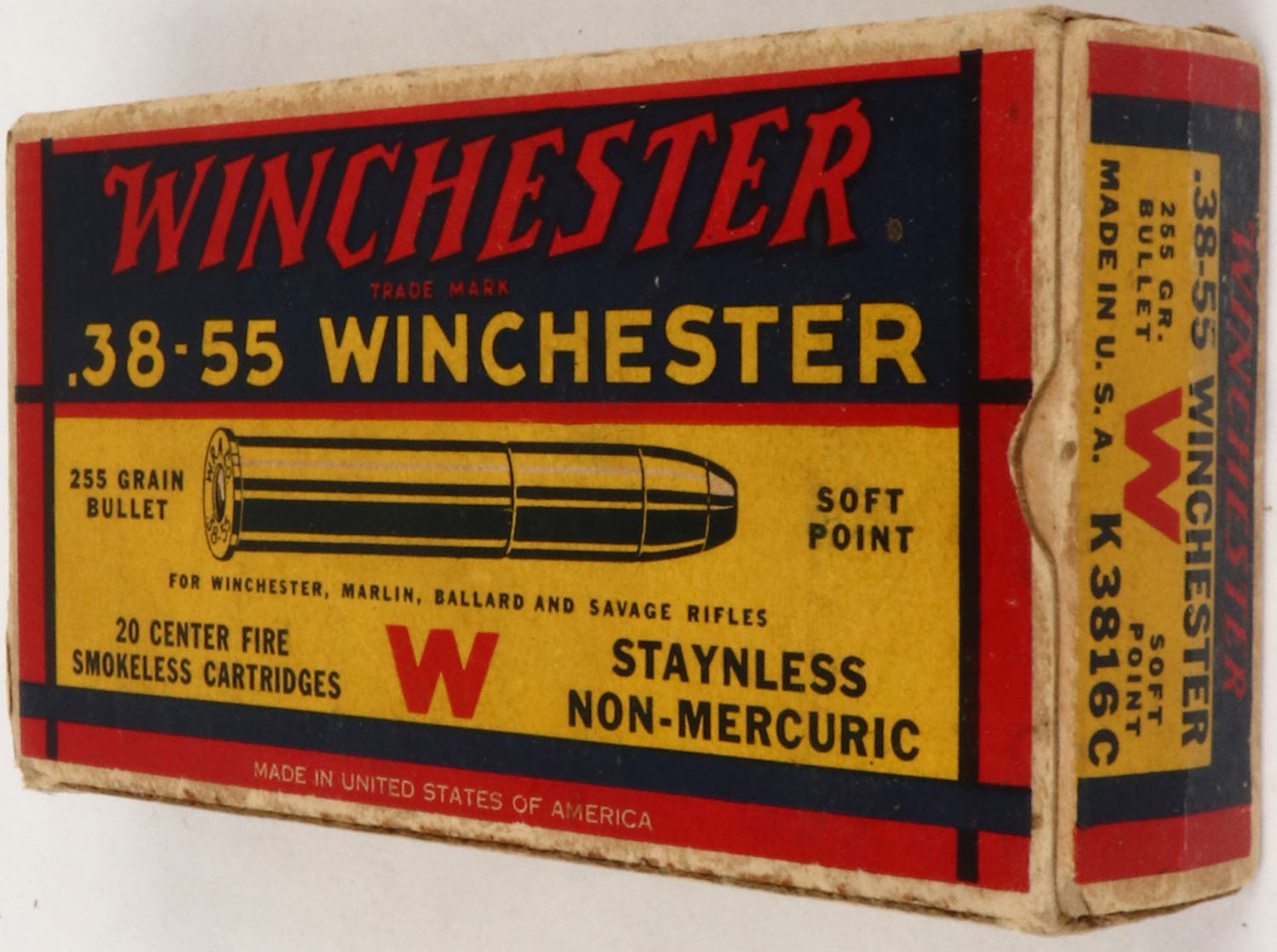 Winchester, .38-55 Winchester, .255 Grain Soft Point Bullet, Full, 1pc. Yellow blue & red box, box is solid with excellent color, some age soiling & edge wear, corner wear, end flaps are solid, ammo is excellent. Grade: Excellent - Value: 40 to 120