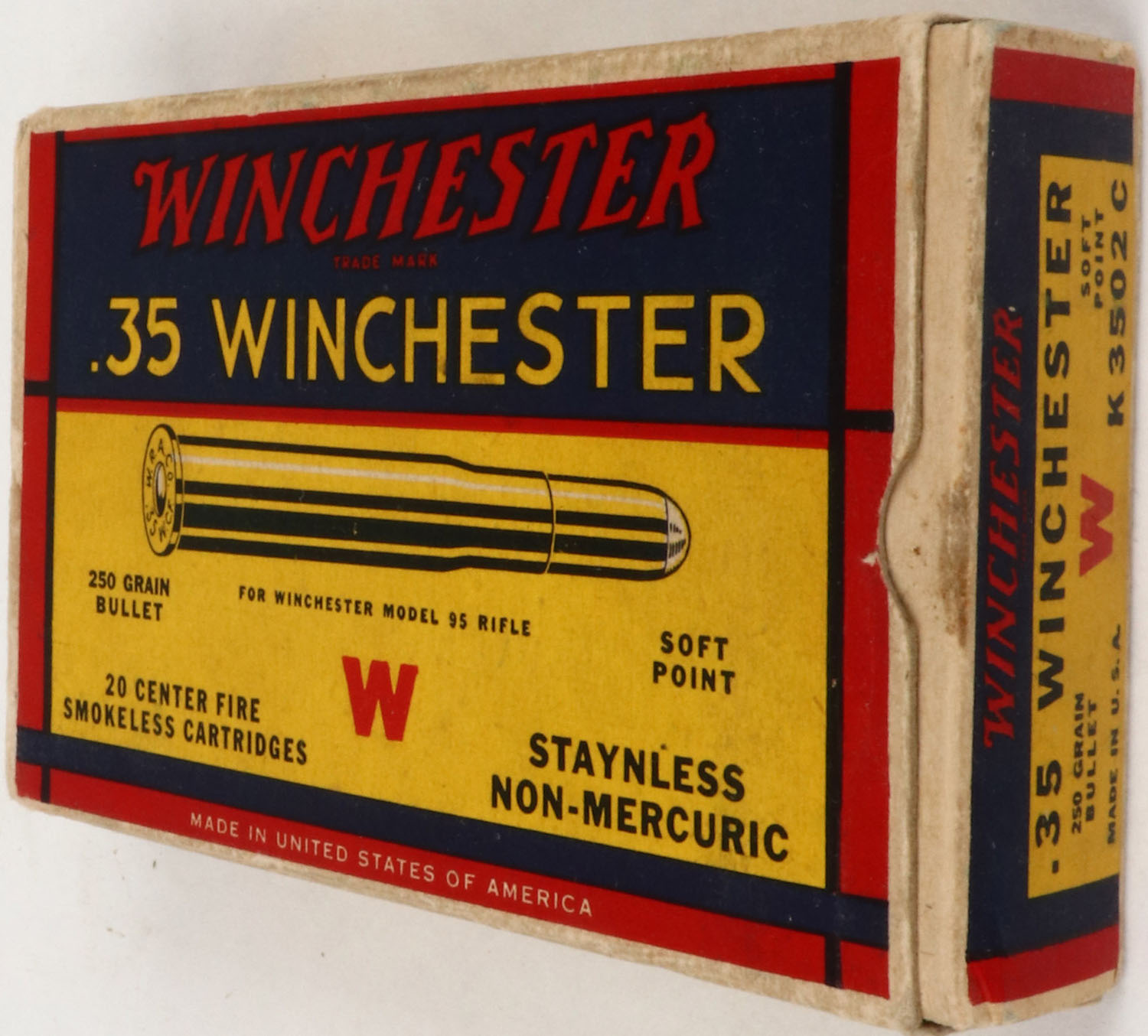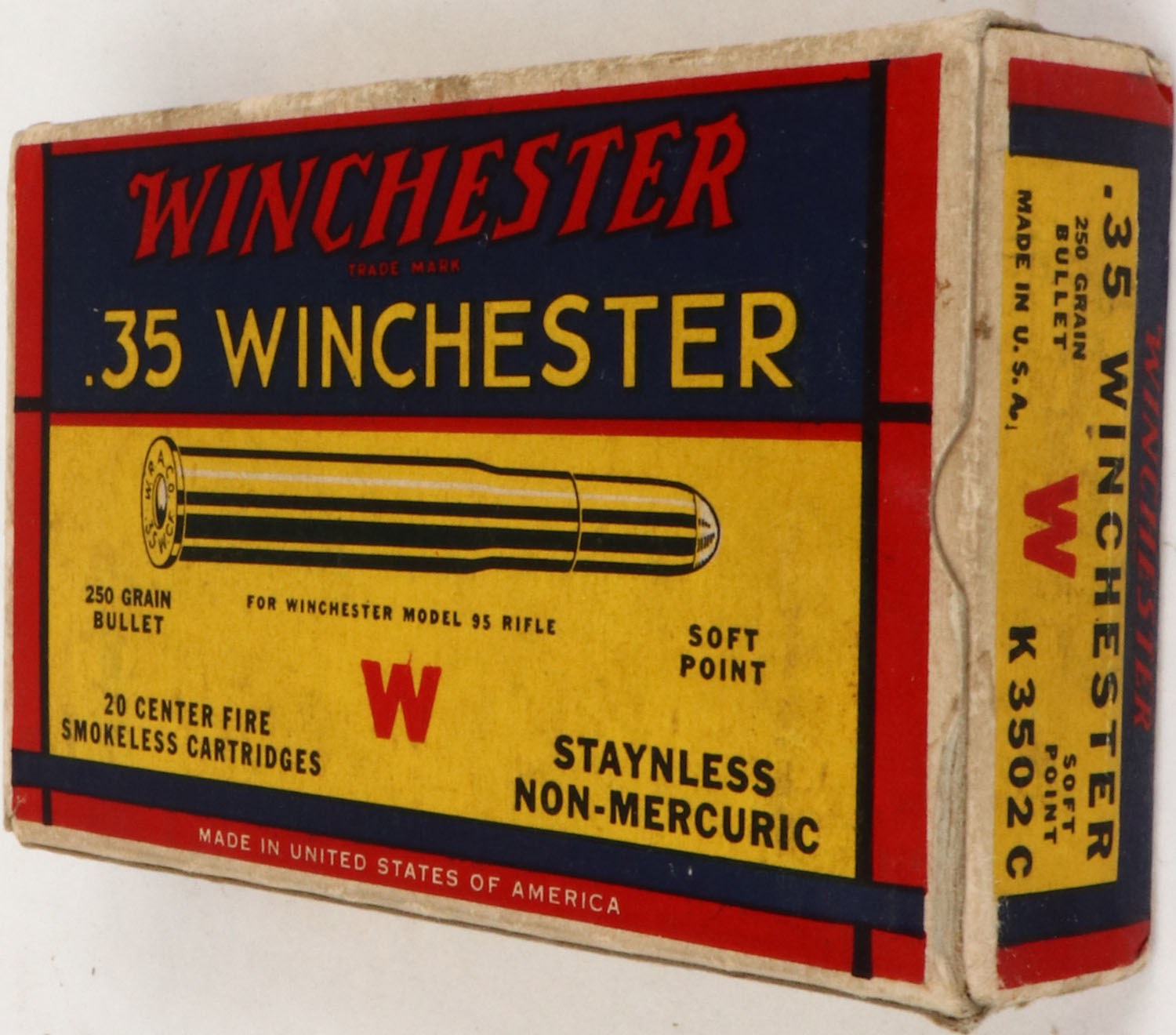 Winchester, .35 Winchester, 250 Grain Soft Point Bullet, Staynless Non-Mercuric, Partial 16rds., 1pc. Yellow blue & red box, box is solid with excellent color, minor age soiling, some corner wear, very minor edge wear, end flaps are solid, ammo is excellent. Grade: Excellent + - Value: 10 to 60