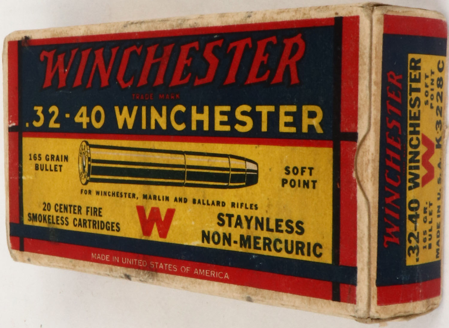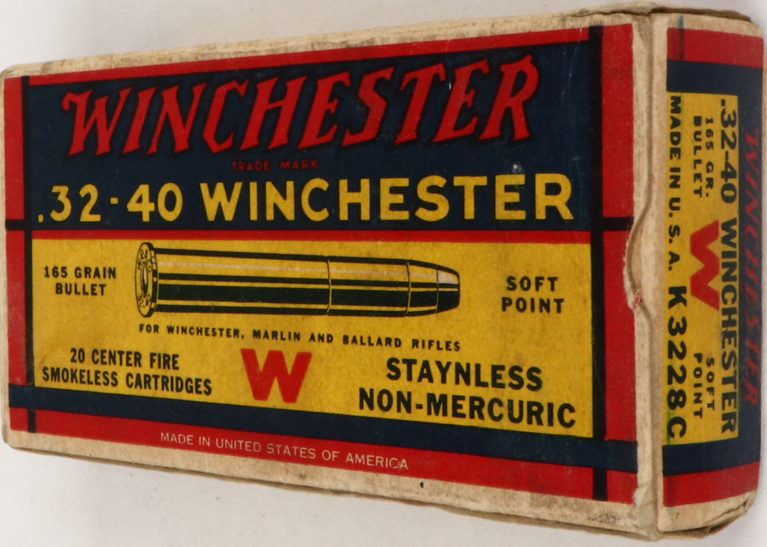 Winchester, .32-40 Winchester, 165 Grain Soft Point Bullet, Full, 1pc. Yellow blue & red box, box is solid with excellent color, some age soiling & corner wear, minor edge wear, end flaps are solid, ammo is excellent. Grade: Very Good ++ - Value: 30 to 90