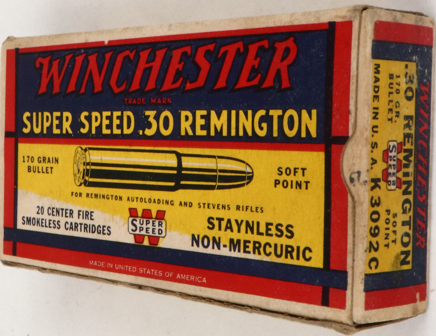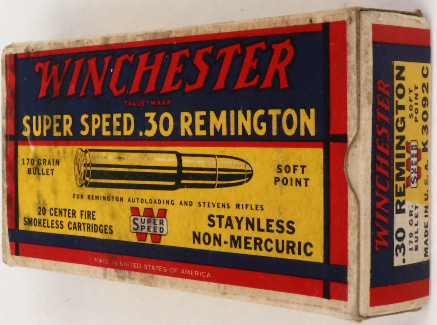 Winchester, Super Speed, .30 Remington, 170 Grain Soft Point Bullet, Staynless Non-Mercuric, Full, 1pc. Yellow blue & red box, box is solid with excellent color, very minor age soiling, some staining to top, very minor corner wear, edges are mostly crisp, end flaps are solid, ammo is very good to excellent. Grade: Very Good ++ - Value: 50 to 150