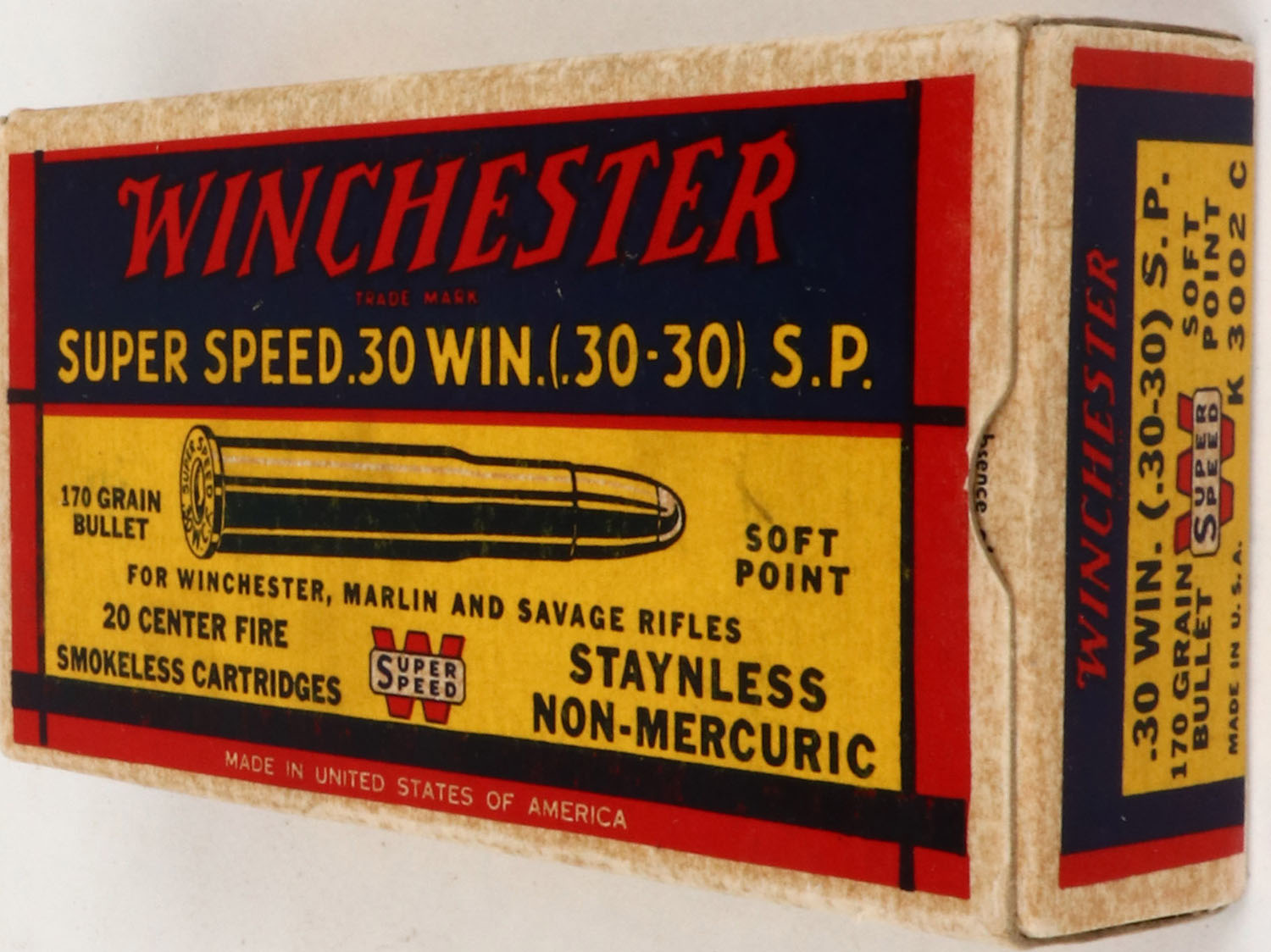 Winchester, Super Speed, .30 Win. (.30-30) S.P., 170 Grain Soft Point Bullet, Full, 1pc. Yellow blue & red box, box is solid with excellent to minty color, very minor age soiling, corners are mostly sharp, edges are crisp, end flaps are solid, ammo is excellent. Grade: Excellent + - Value: 50 to 150