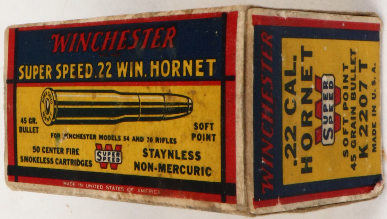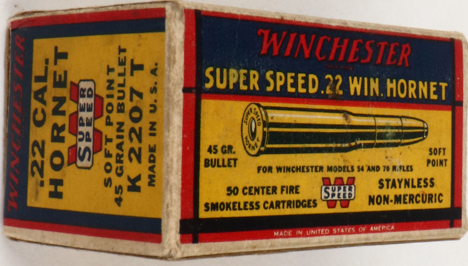 Winchester, Super Speed, .22 Win. Hornet, Full, 1pc. Yellow blue & red box, box is solid with excellent color, minor age soiling, minor staining to front & top, very minor edge & corner wear, end flaps are solid, ammo is excellent. Grade: Excellent - Value: 100 to 300