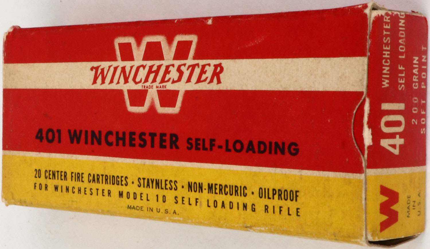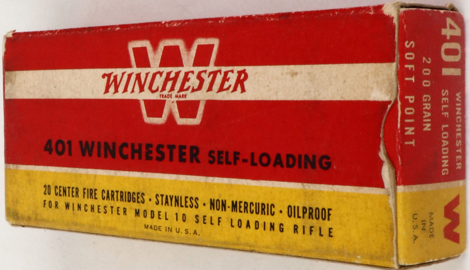 Winchester, .401 Winchester Self-Loading, 200 Grain Soft Point, Full, 1pc. Red yellow & white box, box is solid with excellent color, minor age soiling, very minor corner & edge wear, end flaps are solid, ammo is excellent. Grade: Very Good ++ - Value: 40 to 120