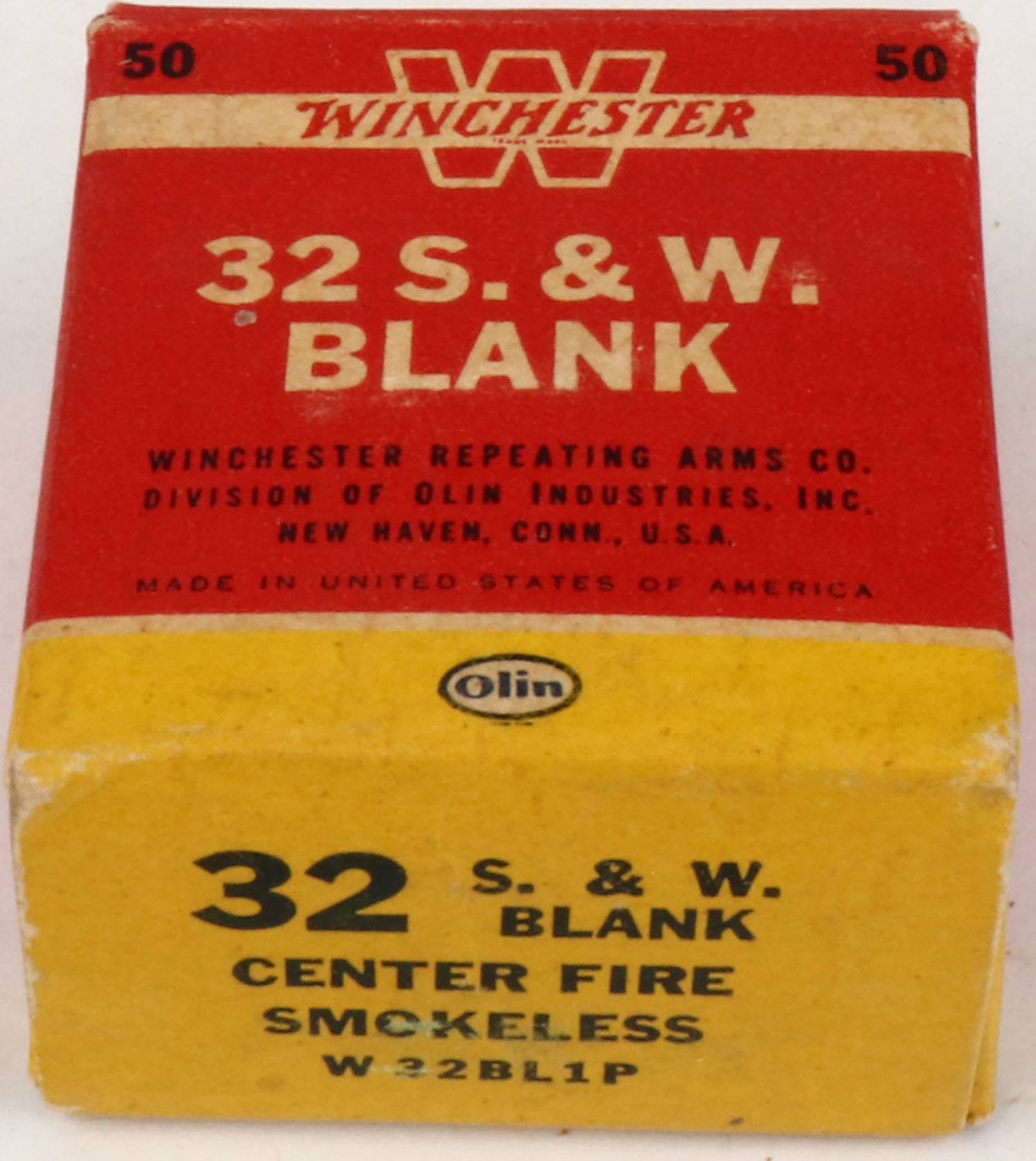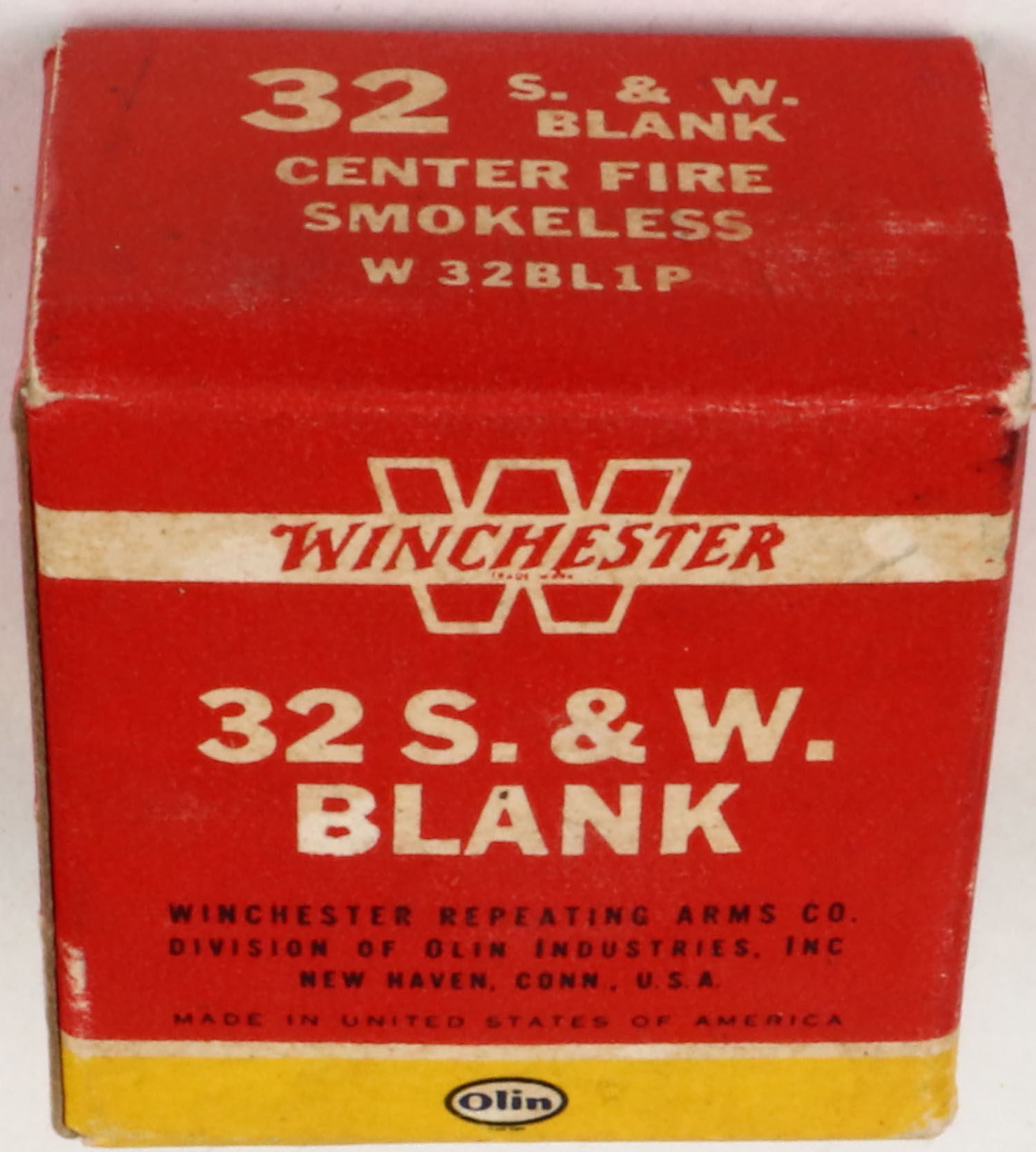 Winchester, 32 S.&W. Blank, 1pc., Full, W32BL1P, red, yellow & white box, box is solid with good color & light rub marks, ammo is excellent. Grade: Excellent - Value: 8 to 40