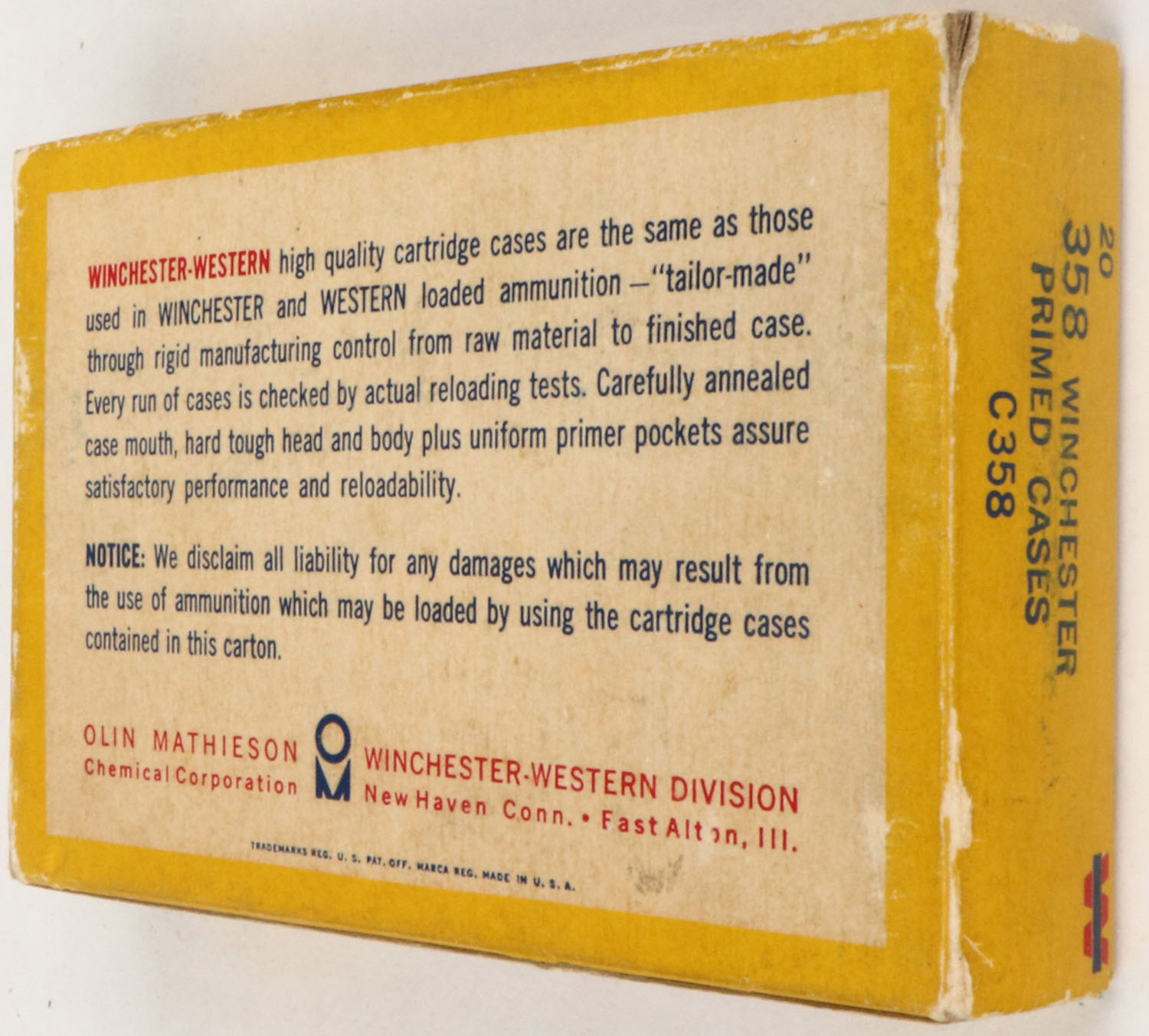 Winchester, Cartridge Cases, .358 Winchester Primed Cases, Full, 1pc. Yellow red & blue box, box is solid with excellent color, minor age soiling, very minor corner wear, edges are mostly crisp, end flaps are solid, ammo is excellent to minty. Grade: Excellent - Value: 10 to 50