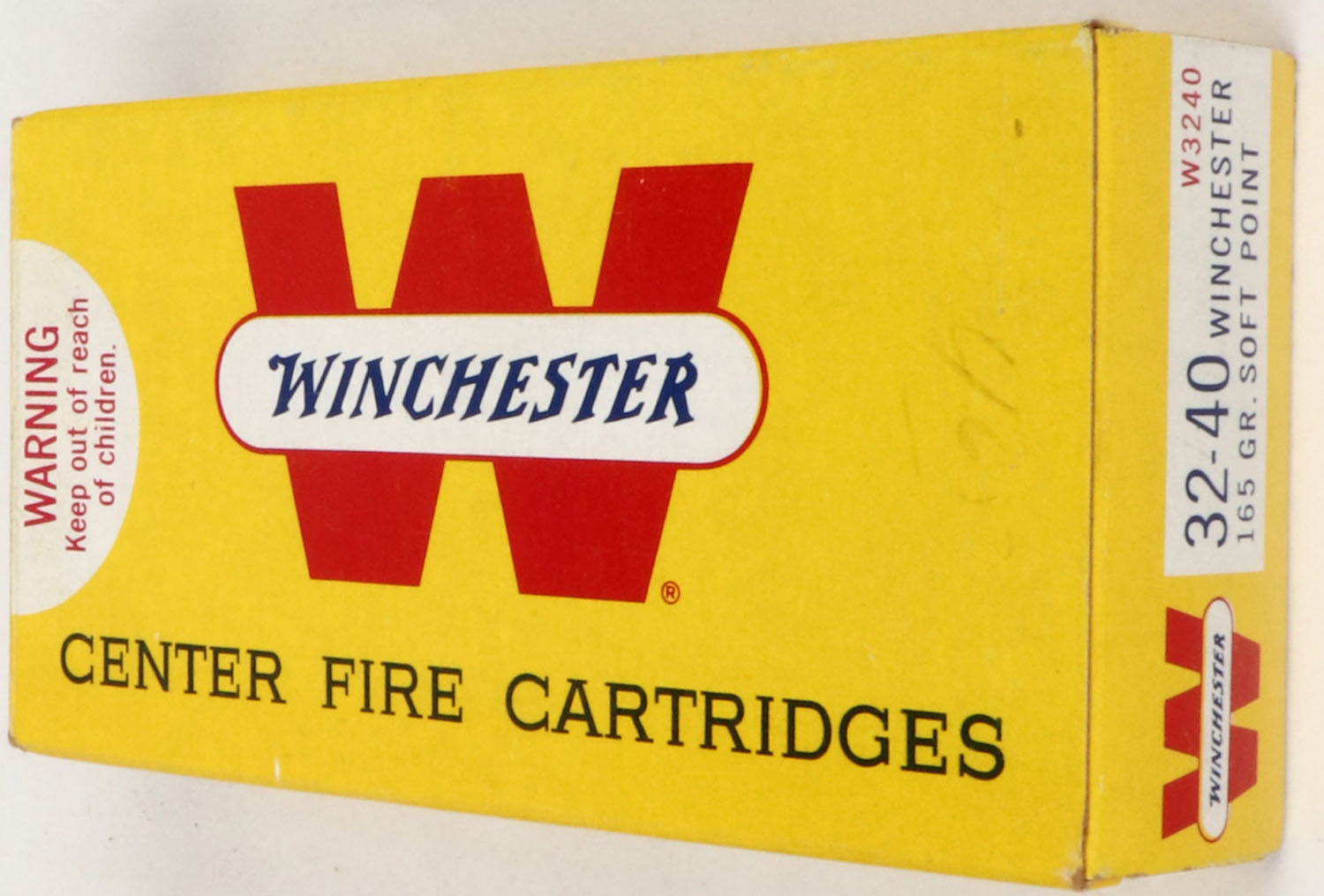 Winchester, .32-40 Winchester, 165 Grain Soft Point, Full, 1pc. Yellow white & red box, box is solid with excellent color, very minor corner wear, edges are crisp, top has been written on, end flaps are solid, ammo is excellent. Grade: Excellent + - Value: 20 to 60