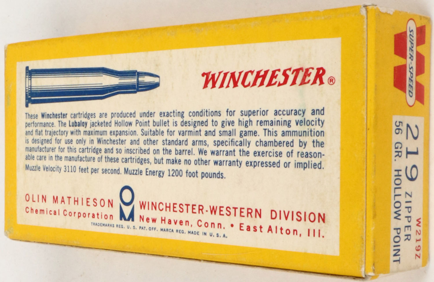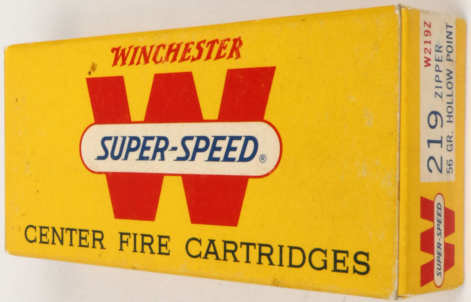 Winchester, Super-Speed, .219 Zipper, 56 Gr. Hollow Point, Full, 1pc. Yellow red & white box, box is solid with excellent color, very minor shelf & corner wear, edges are crisp, end flaps are solid, ammo is excellent to minty. Grade: Excellent + - Value: 60 to 180