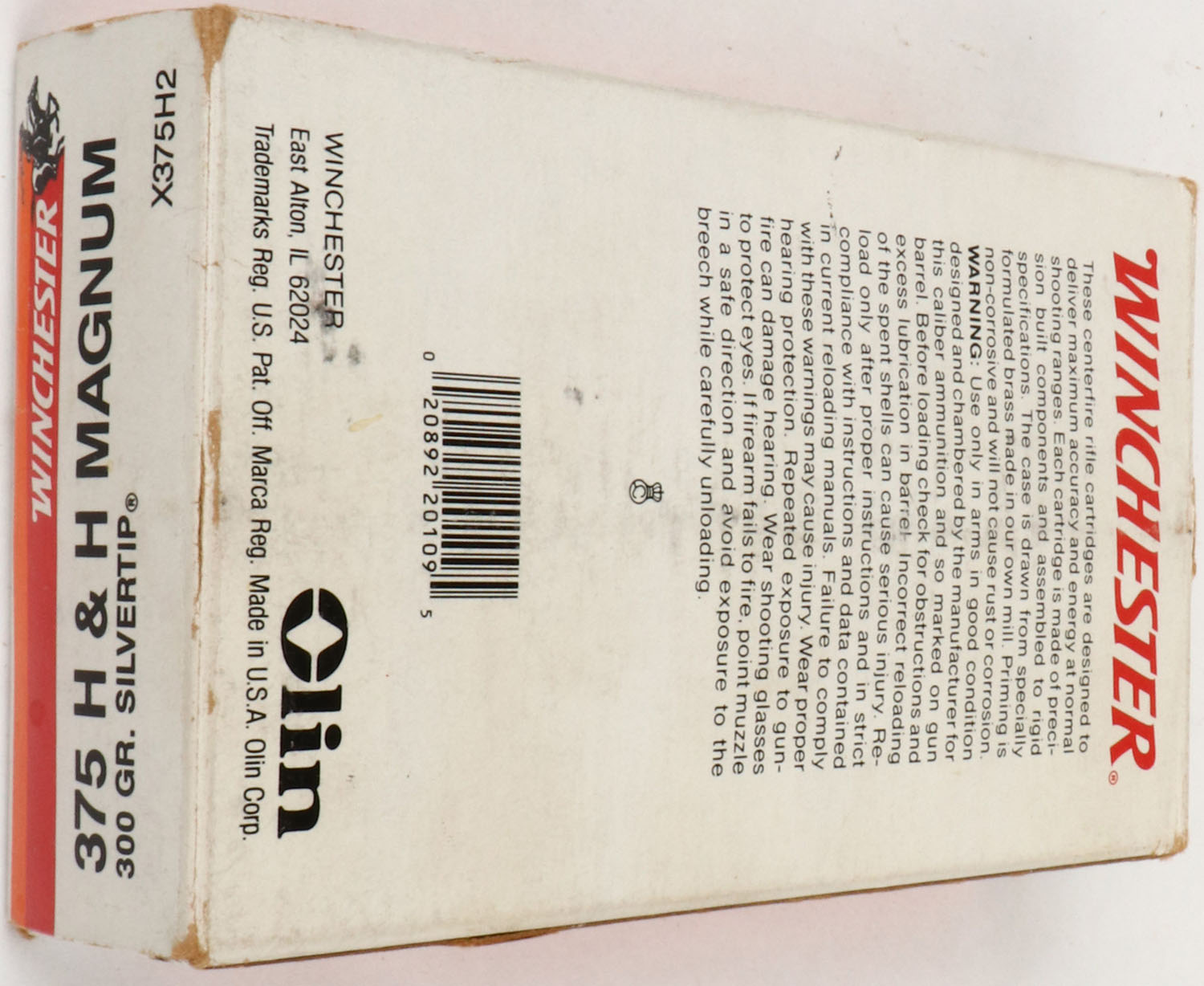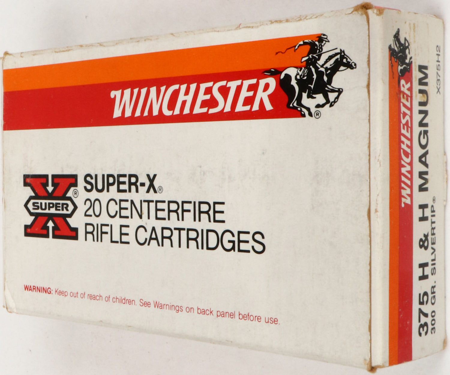 Winchester, Super-X, .375 H&H Magnum, 300 Gr. Silvertip, Full, 1pc. White red & orange box, box is solid with excellent color, very minor age soiling & corner wear, edge wear, end flaps are solid, ammo is excellent. Grade: Very Good ++ - Value: 40 to 80