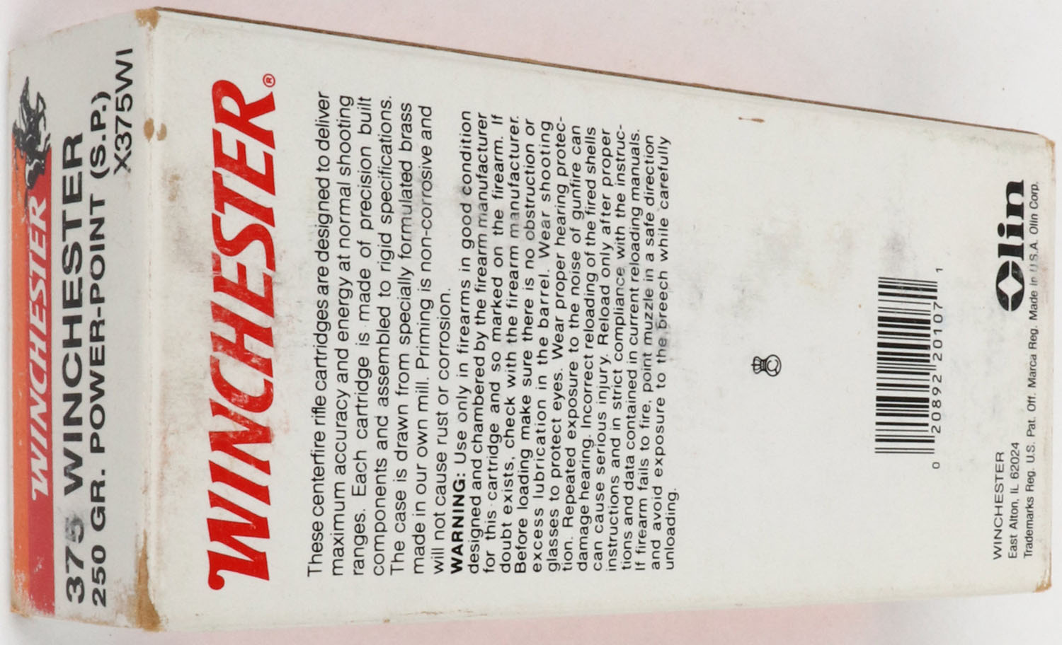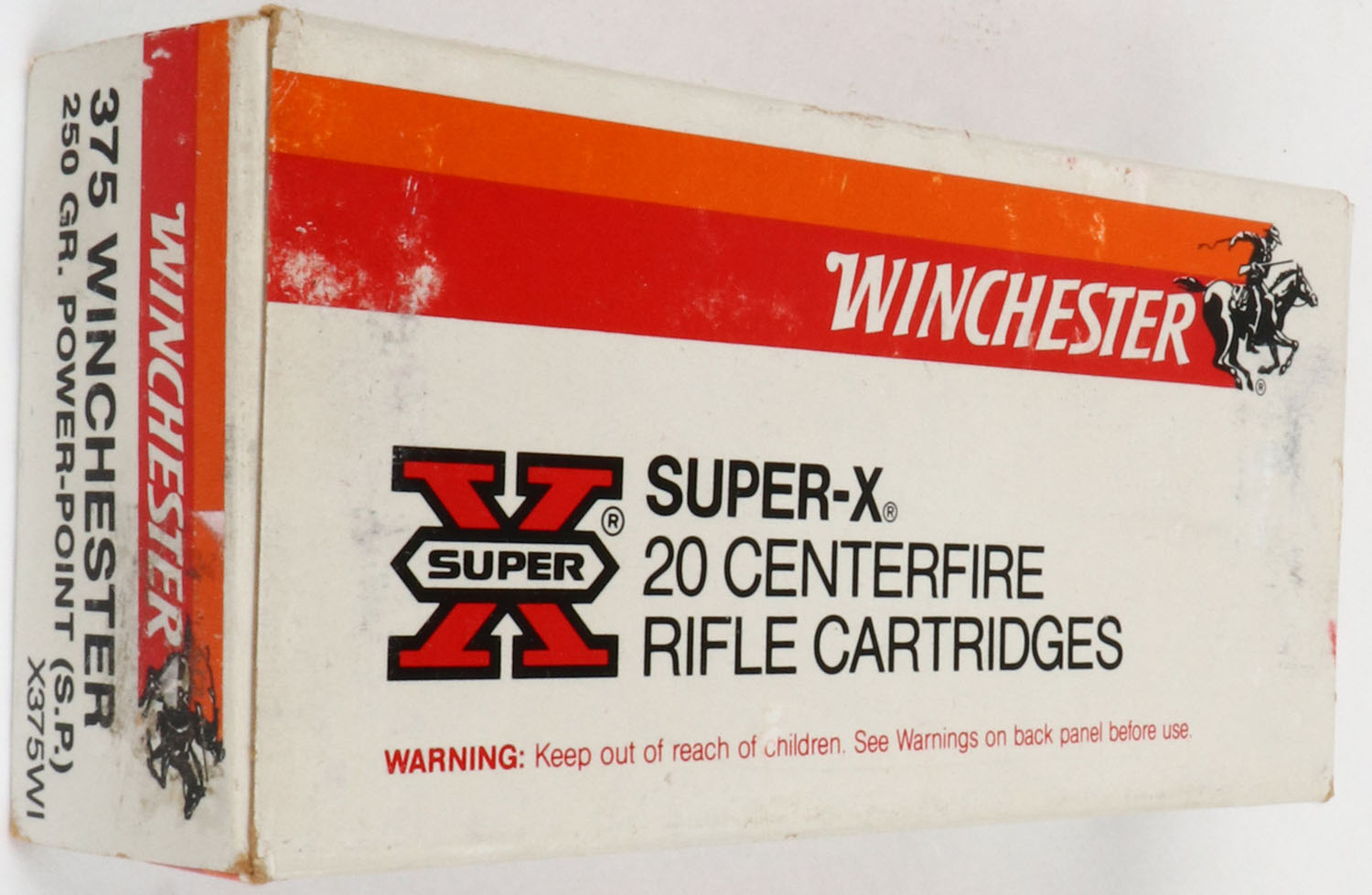 Winchester, Super-X, .375 Winchester, 250 Gr. Power-Point (S.P.), Full, 1pc. White red & orange box, box is solid with excellent color, very minor shelf & corner wear, edges are crisp, end flaps are solid, ammo is excellent. Grade: Excellent - Value: 30 to 90