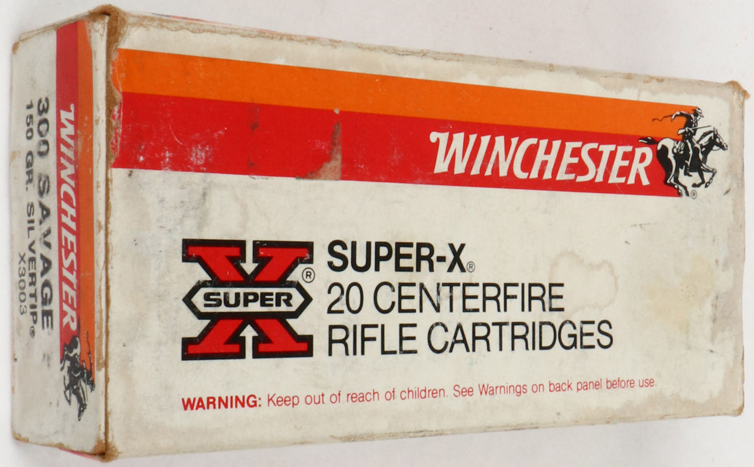 Winchester, Super-X, .300 Savage, 150 Gr. Silvertip, Full, 1pc. White red & orange box, box is solid with very good to excellent color, age soiling, staining, some edge & corner wear, end flaps are solid, ammo is excellent. Grade: Very Good ++ - Value: 20 to 80