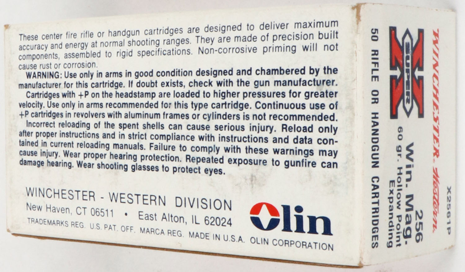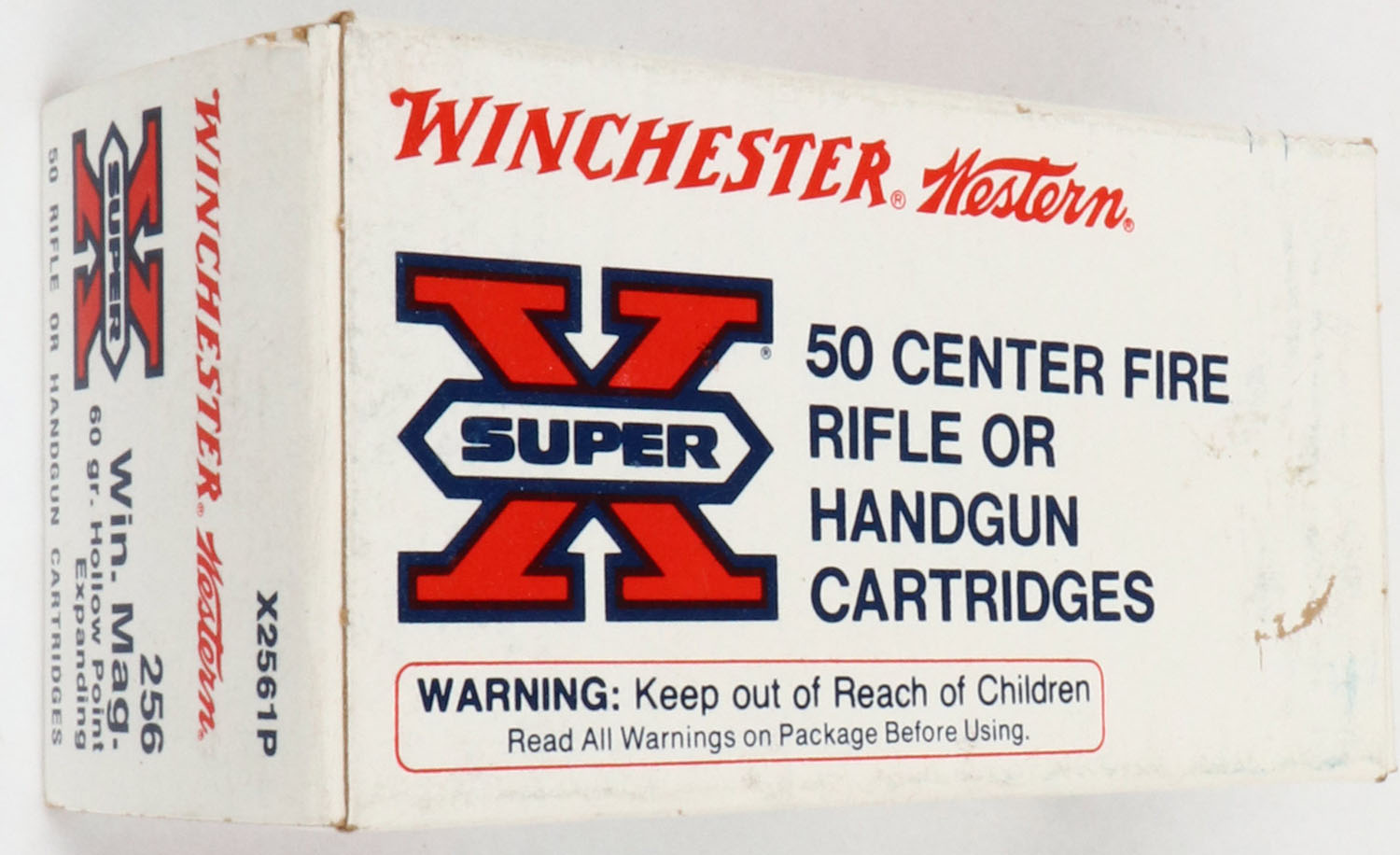Winchester-Western, Super X, 256 Win. Mag., 60 Gr. Hollow Point Expanding, Full, 1pc. White red & blue box, box is solid with excellent color, very minor shelf wear, corners are mostly sharp, edges are crisp, end flaps are solid, ammo is excellent to minty. Grade: Excellent + - Value: 30 to 120
