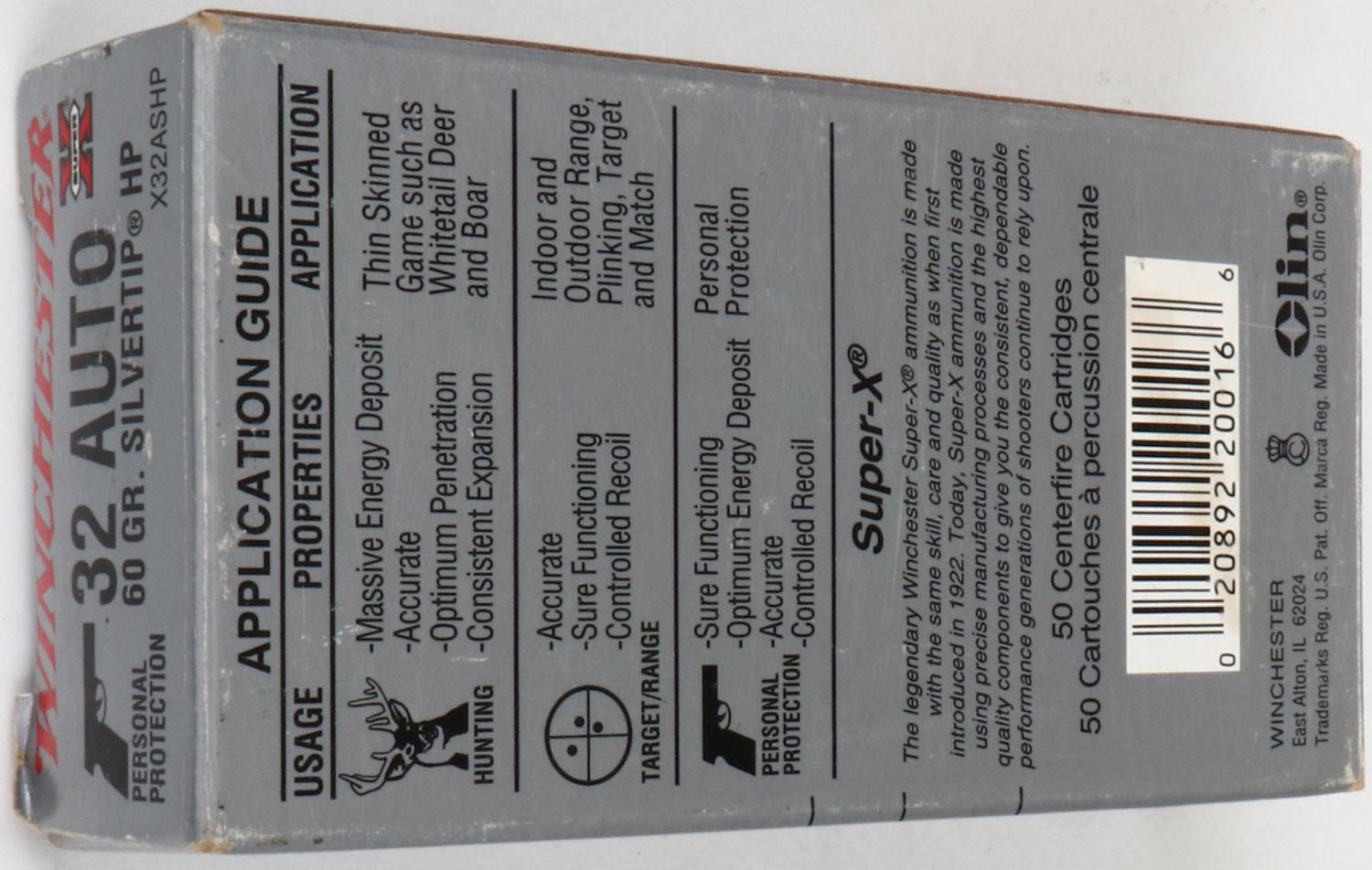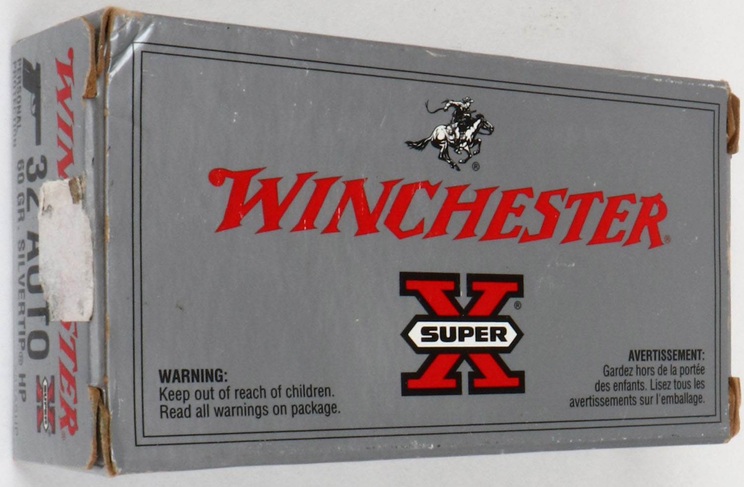 Winchester, Super X, .32 Auto, 60 Gr. Silvertip Hollow Point, Full, 1pc. Silver & red box, box is solid with excellent color, very minor corner wear, edges are mostly crisp, end flaps are solid, ammo is minty. Grade: Excellent - Value: 20 to 60