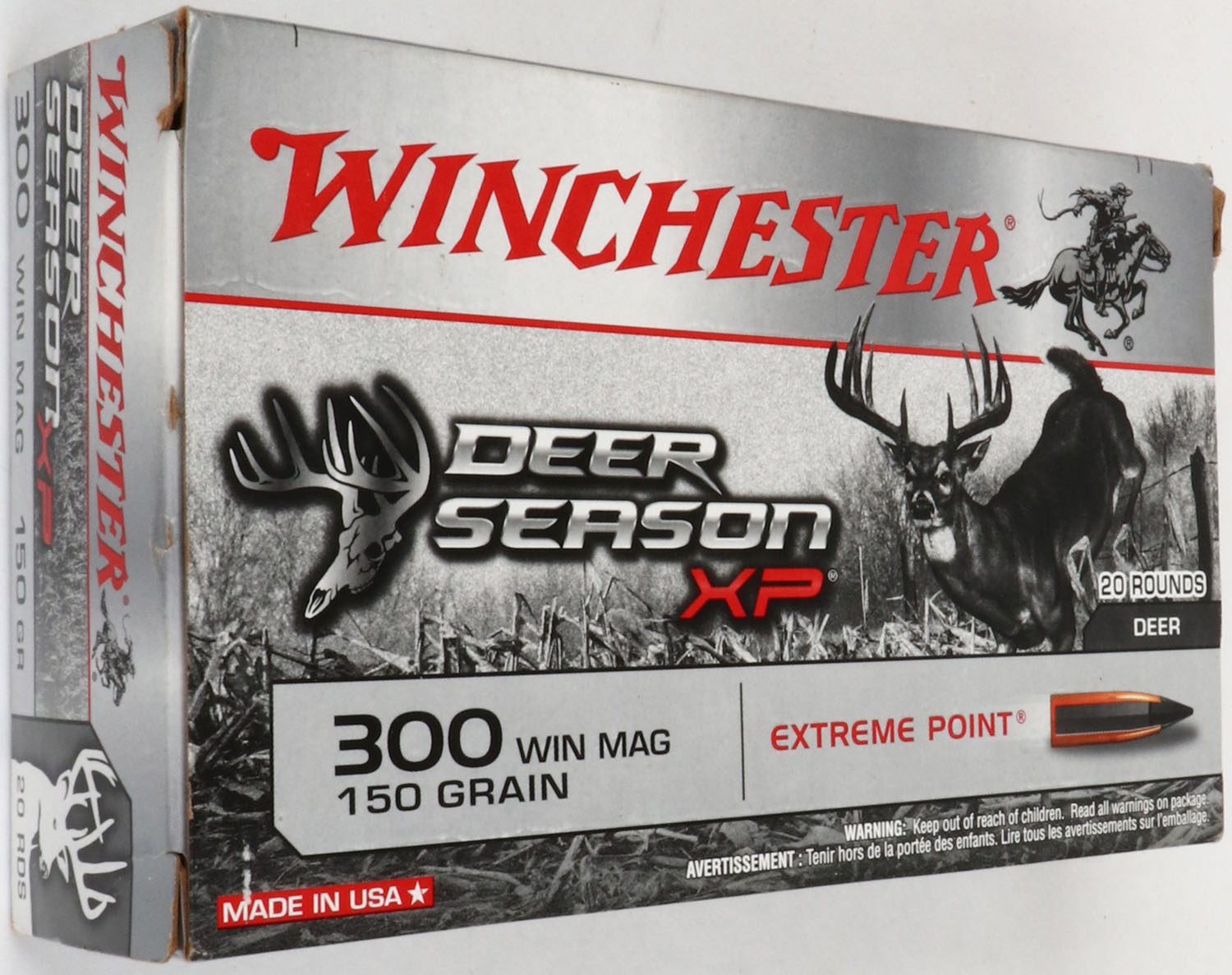 Winchester, Deer Season XP, .300 Win. Mag., 150 Grain Extreme Point, Partial 17rds. Correct (3 incorrect Weatherby .300 Magnum rds.), 1pc. Silver gray & red box, box is solid with minty color, very minor corner wear, edges are crisp, end flaps are solid, ammo is minty. Grade: Excellent + - Value: 10 to 50