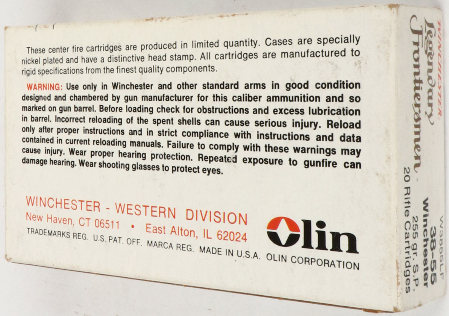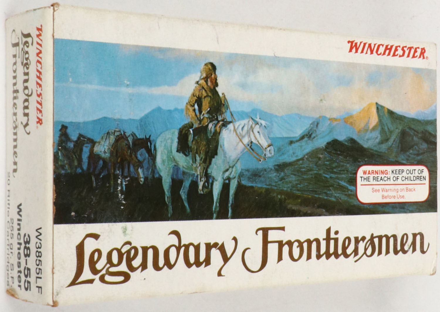 Winchester, Legendary Frontiersman, .38-55 Winchester, 255 gr. S.P., Full, 1pc. Multicolored box, box is solid with excellent color, very minor age soiling & corner wear, edges are crisp, end flaps are solid, ammo is excellent to minty. Grade: Excellent + - Value: 30 to 60