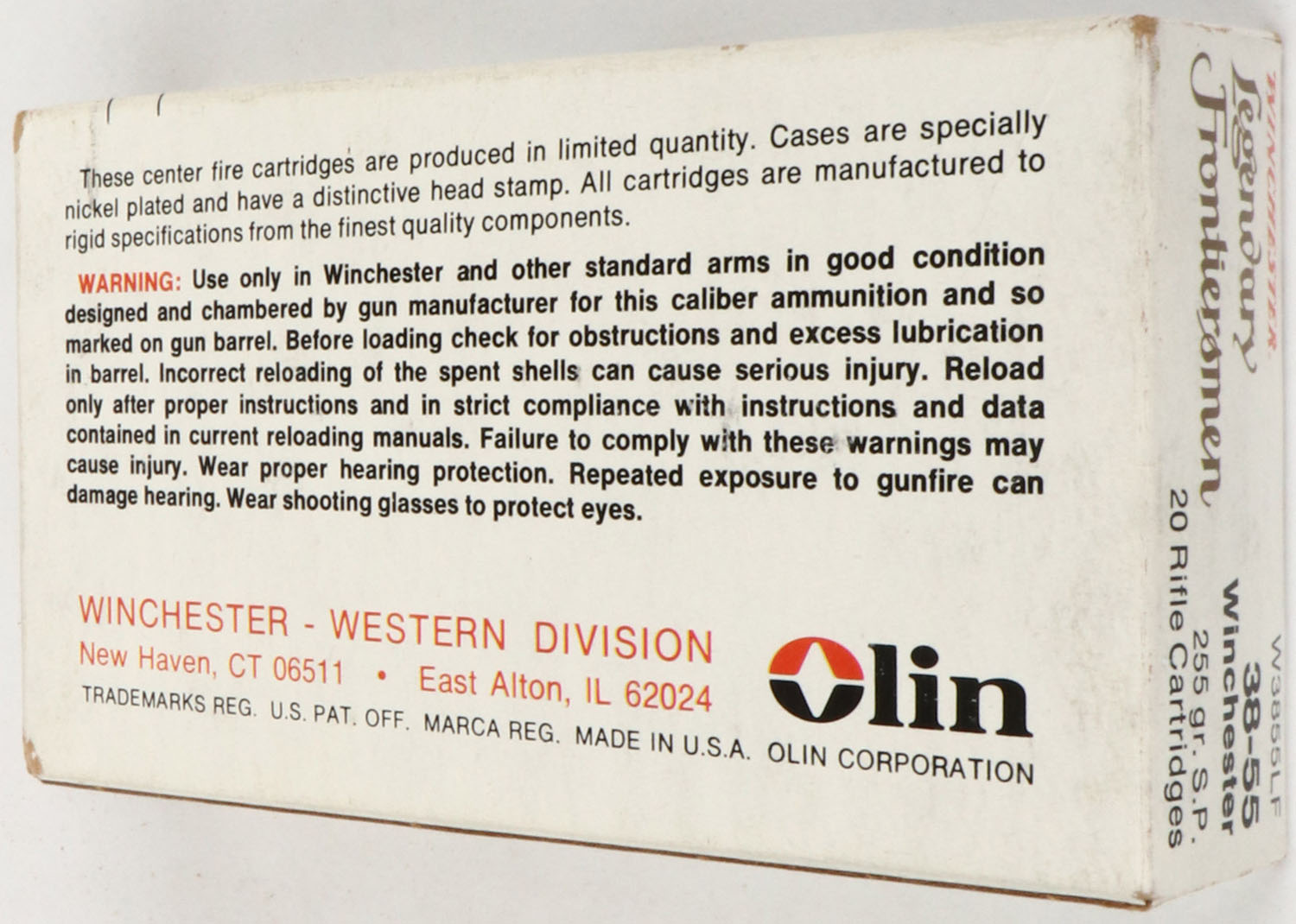 Winchester, Legendary Frontiersman, .38-55 Winchester, 255 gr. S.P., Full, 1pc. Multicolored box, box is solid with excellent color, very minor age soiling & corner wear, edges are crisp, end flaps are solid, ammo is excellent to minty. Grade: Excellent + - Value: 30 to 60