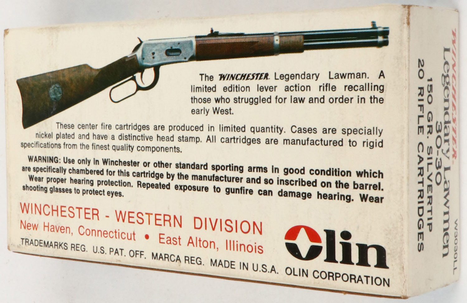 Winchester, Legendary Lawmen, .30-30 Win., 150 Gr. Silvertip, Full, 1pc. Multicolored box with French over label on front, box is solid with excellent color, very minor age soiling, corners are sharp, edges are crisp, end flaps are solid, ammo is excellent to minty. Grade: Excellent + - Value: 40 to 80