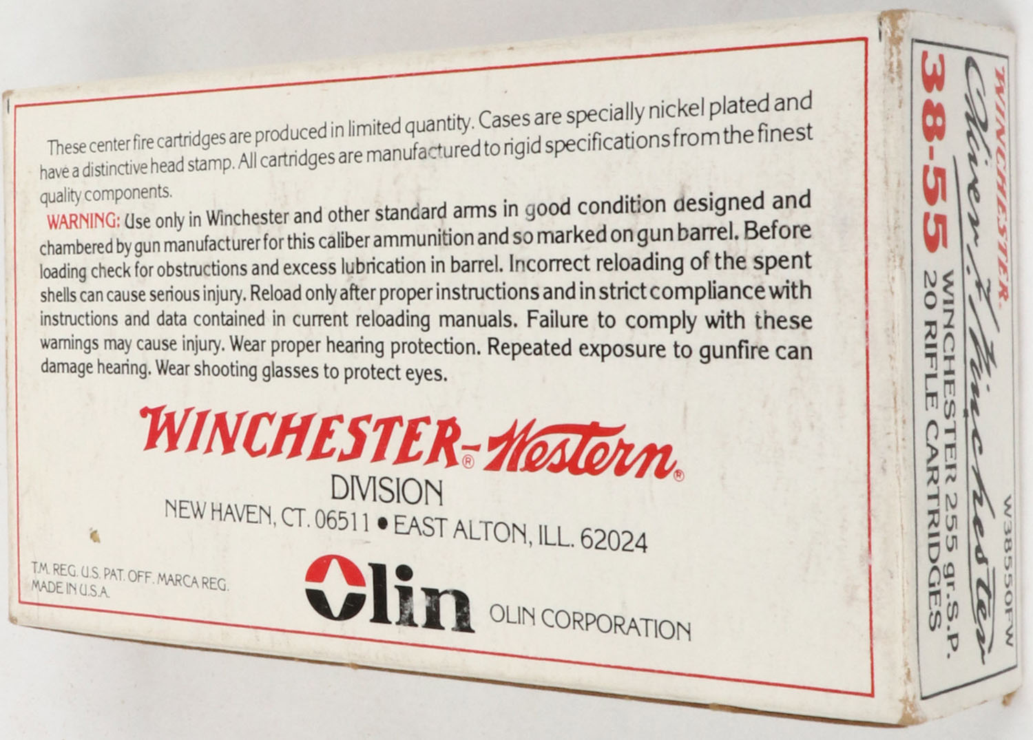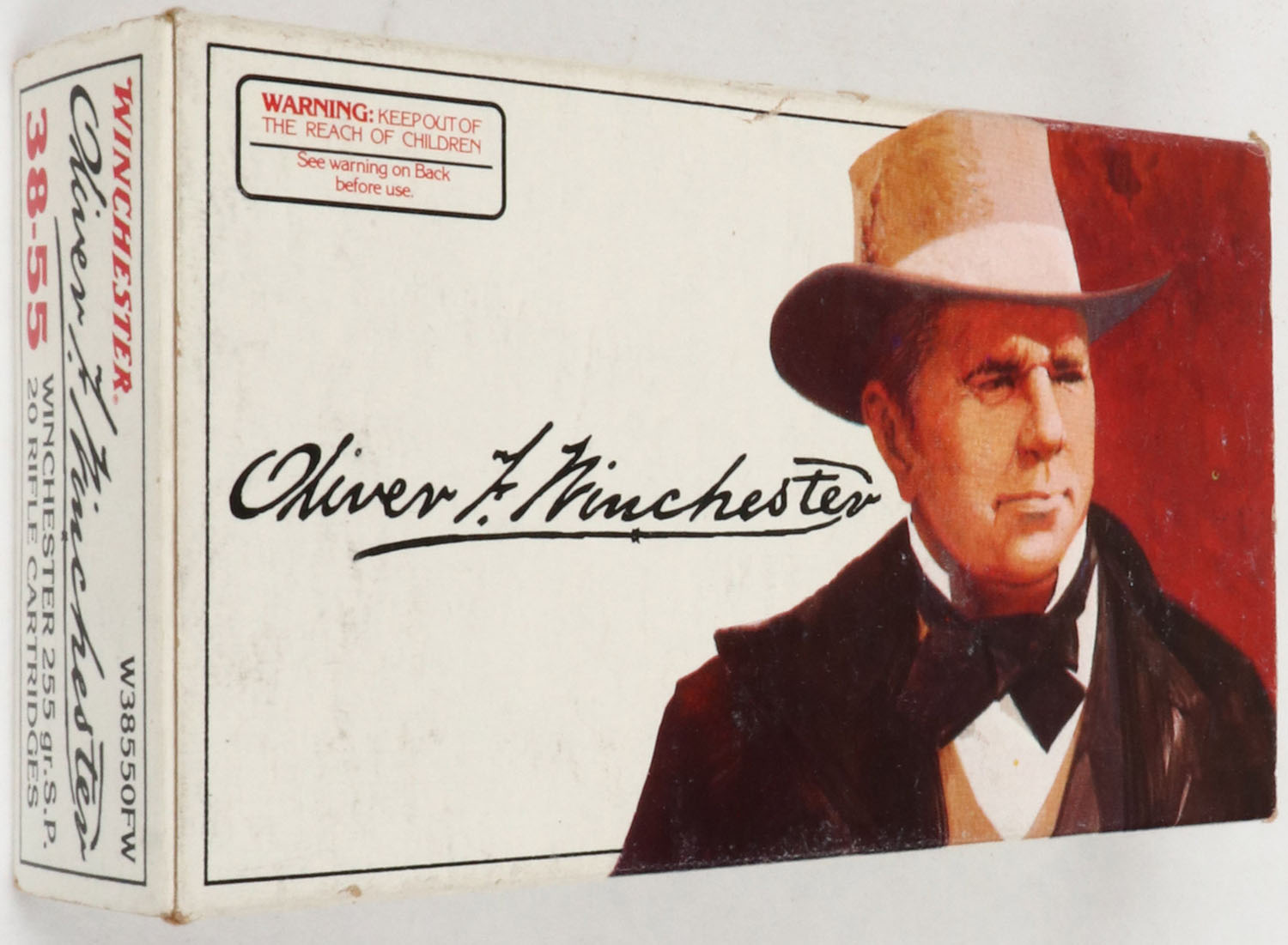 Winchester, Oliver F. Winchester Commemorative, .38-55, 255 Gr. S.P., Full, 1pc. White box featuring portrait of Oliver Winchester, box is solid with excellent color, very minor age soiling & corner wear, edges are crisp, end flaps are solid, ammo is excellent to minty. Grade: Excellent + - Value: 40 to 80