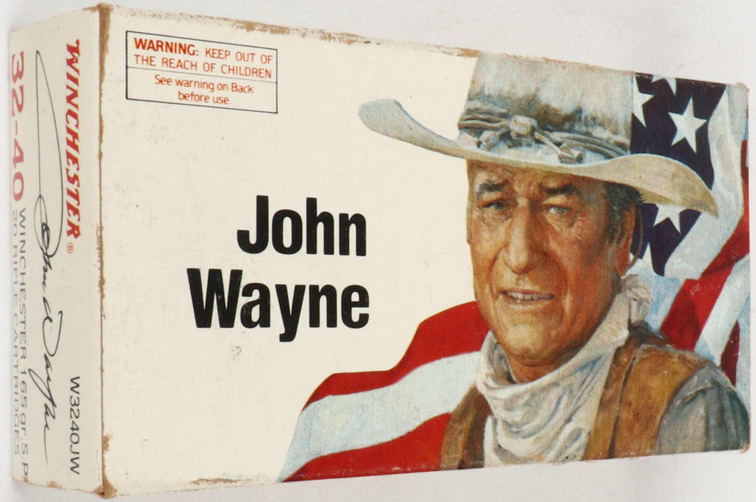 Winchester, John Wayne, .32-40 Winchester, 165 Gr. S.P., Full, 1pc. White box featuring the Duke, very minor age soiling, very minor edge & corner wear, end flaps are solid, ammo is excellent to minty. Grade: Excellent + - Value: 50 to 100
