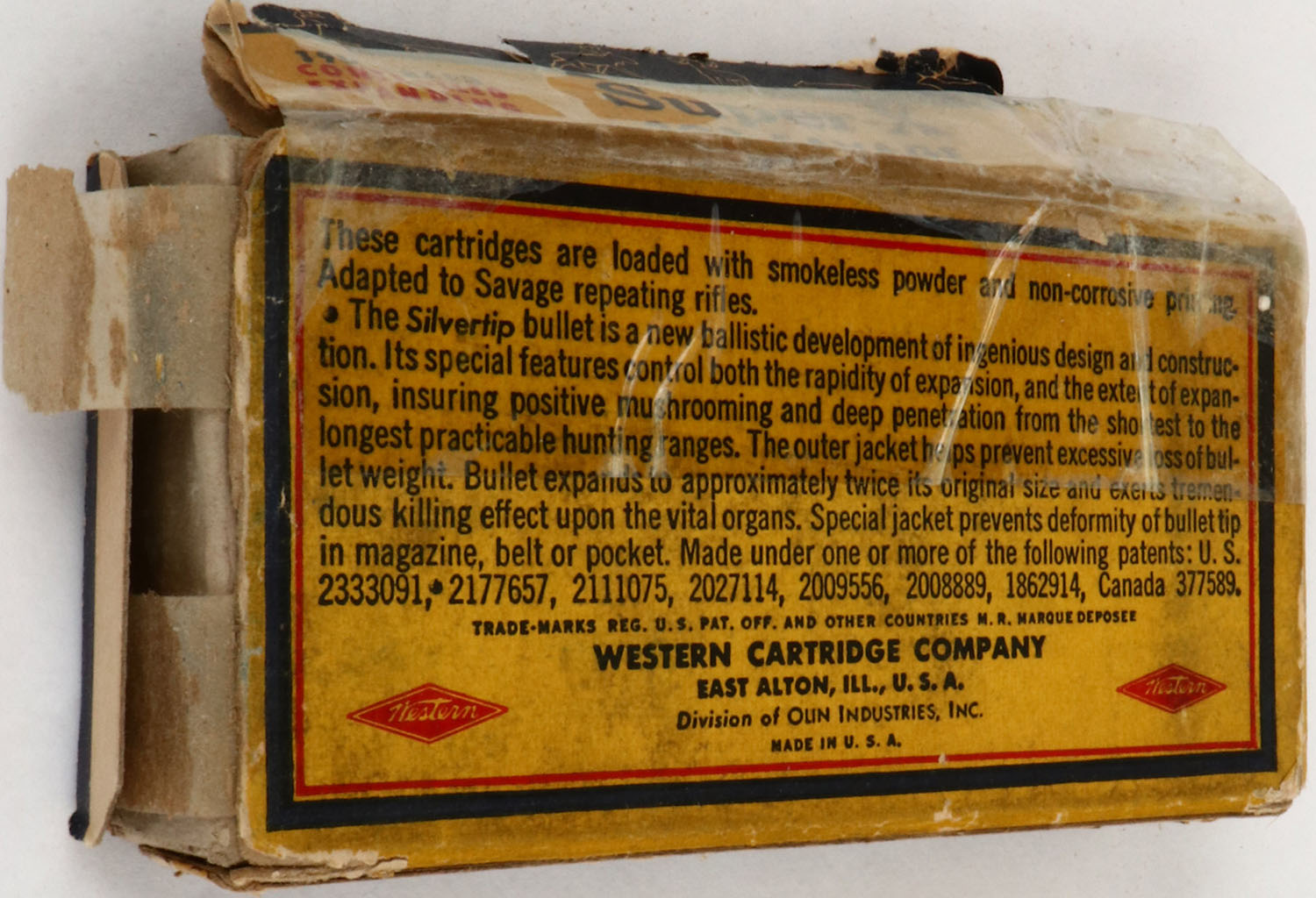 Western, Super-X, .303 Savage, 190 Grain Silvertip Bullet, Full, 1pc. Yellow blue & red Bear Box, Back is torn off and taped, right end flap is torn, edge & corner wear, box has excellent color with some age soiling, ammo is excellent. Grade: Fair + - Value: 20 to 60