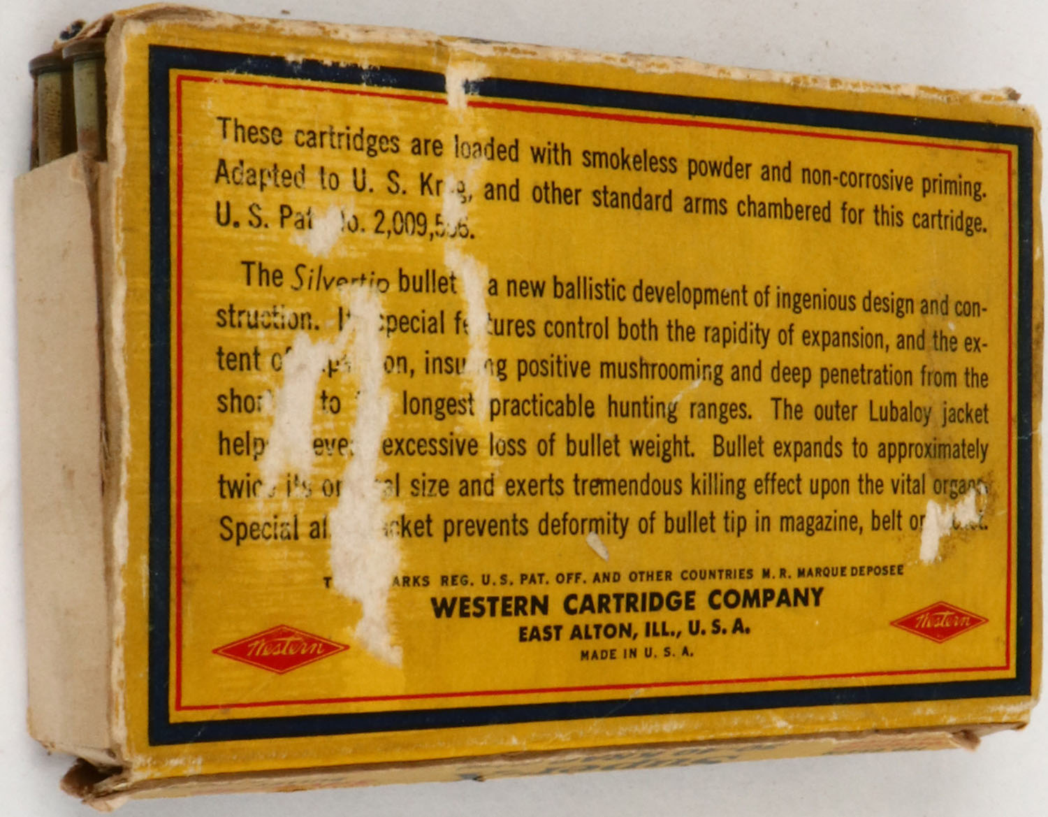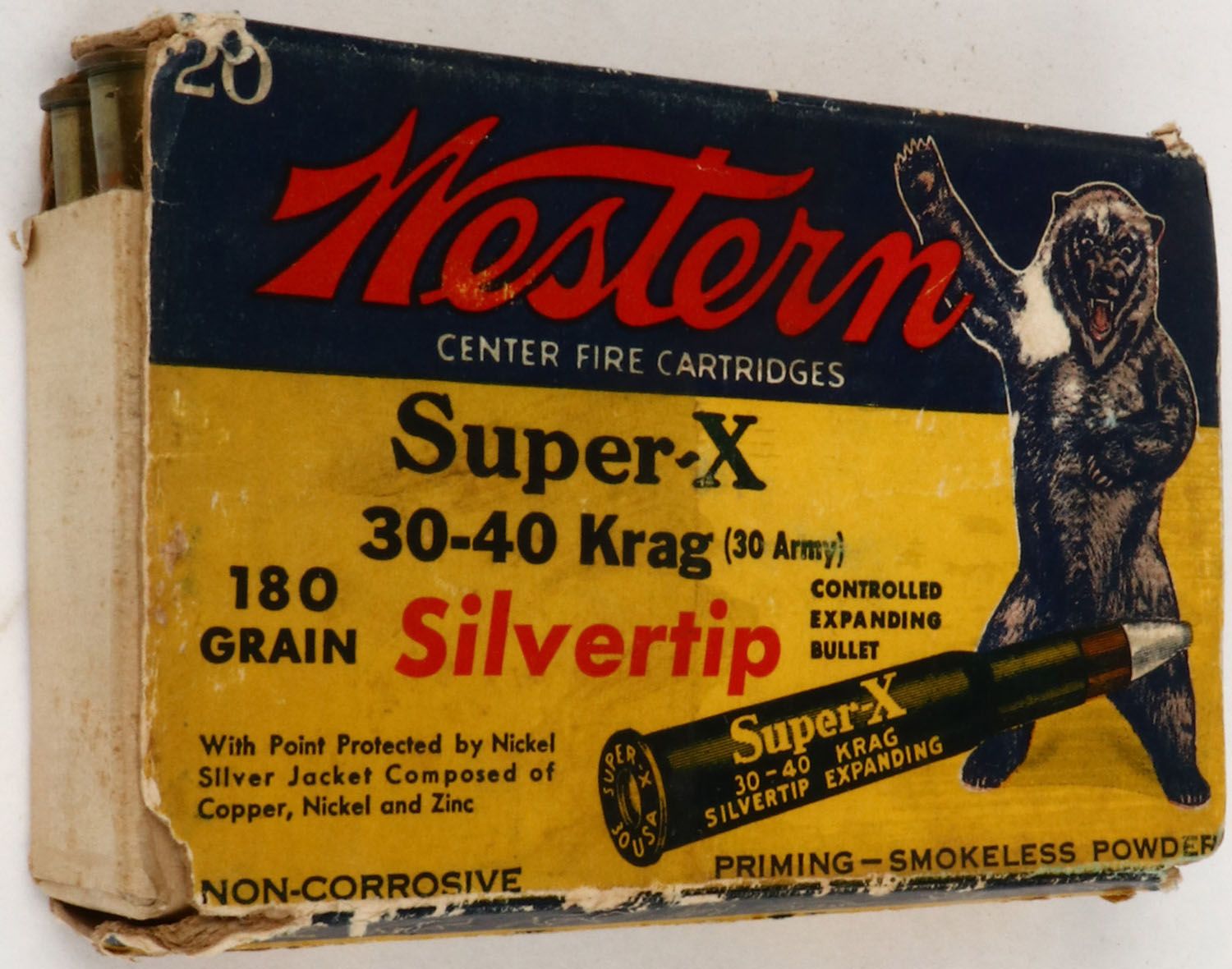 Western, Super-X, .30-40 Krag (30 Army), 180 Grain Silvertip Bullet, Full, 1pc. Yellow blue & red Bear Box, box is missing both end flaps, has excellent color with age soiling, scuffing to top & bottom, edge & corner wear, ammo is excellent. Grade: Good ++ - Value: 20 to 60