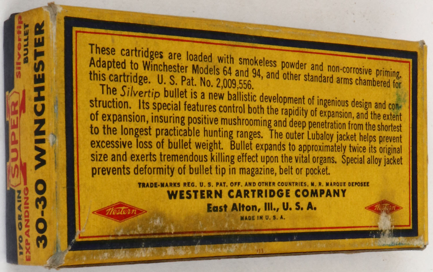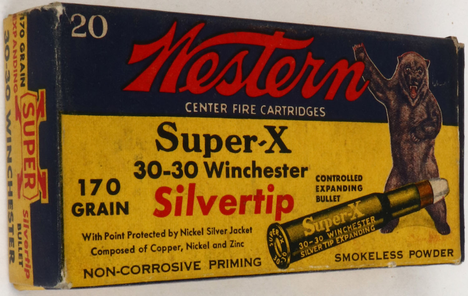 Western, Super-X, .30-30 Winchester, 170 Grain Silvertip Bullet, Full of Mixed incorrect ammo, 1pc. Yellow blue & red Bear Box, factory seam is split, excellent color, minor age soiling & corner wear, edges are crisp, end flaps are solid, ammo is excellent. Grade: Very Good - Value: 30 to 90