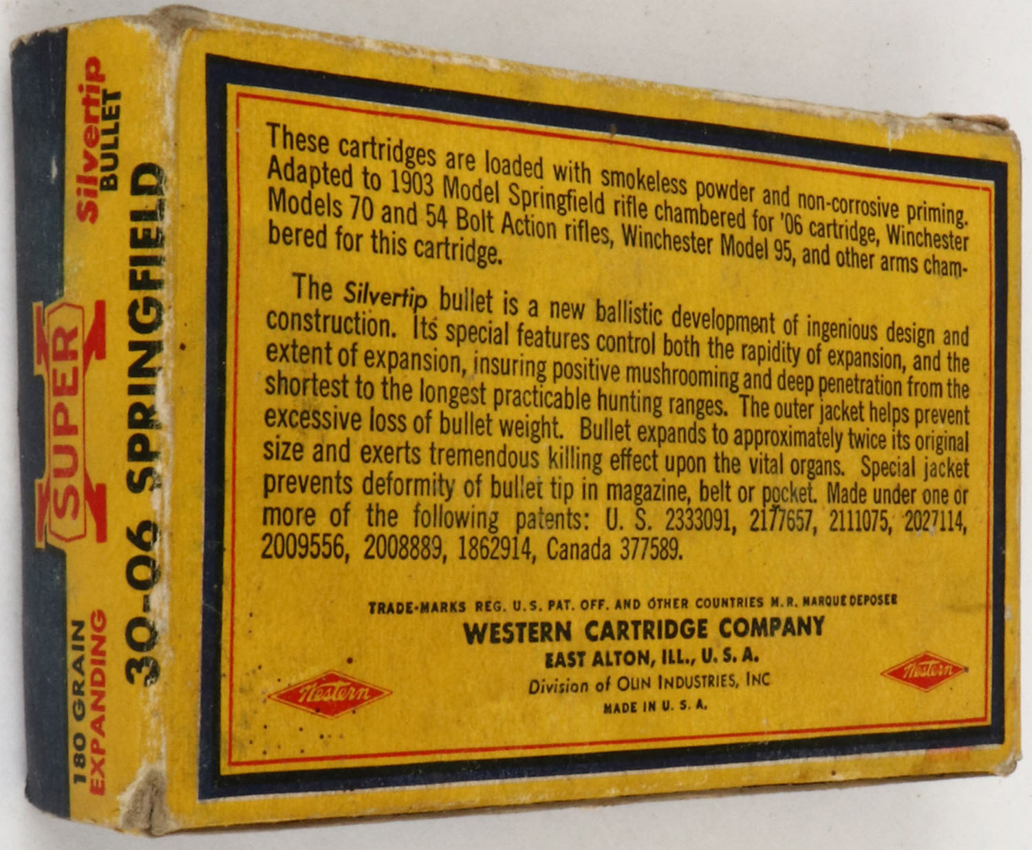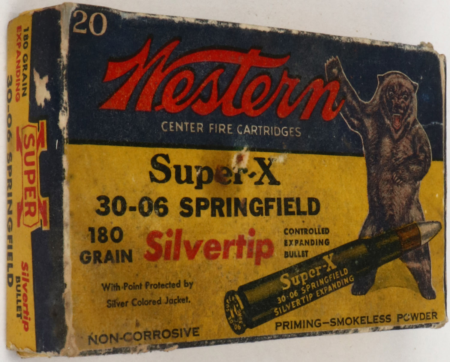 Western, Super-X, .30-06 Springfield, 180 Grain Silvertip Bullet, Full, 1pc. Yellow blue & red Bear Box, box is solid with good to very good color, age soiling, shelf wear, edge & corner wear, end flaps are solid, ammo is very good to excellent. Grade: Very Good ++ - Value: 30 to 60