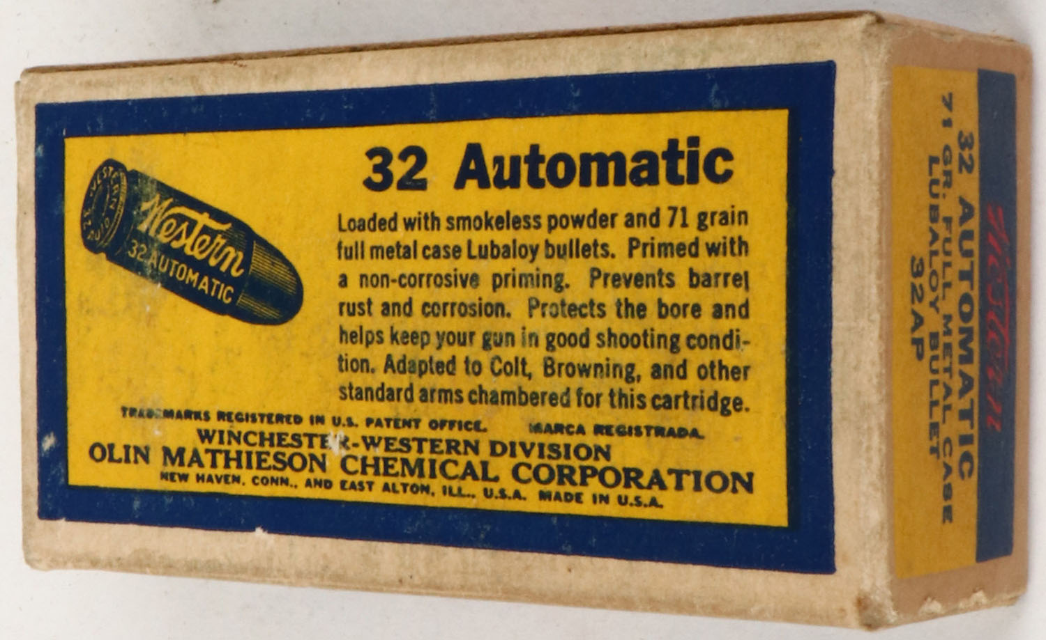 Western, .32 Automatic, 71 Grain Lubaloy Bullet, Full of mixed H/S, 1pc. Blue yellow & red bulls eye box, box is solid with excellent color, very minor age soiling, very minor edge & corner wear, end flaps are solid, ammo is excellent. (1520) Grade: Excellent - Value: 10 to 50