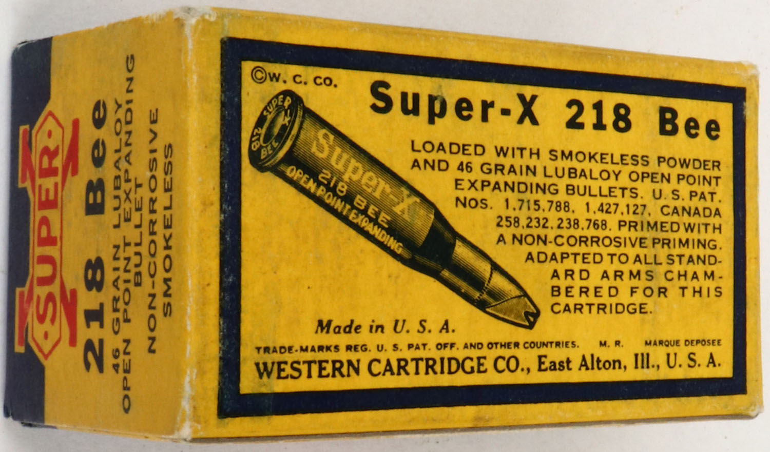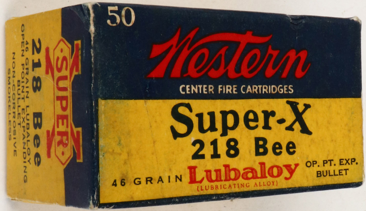 Western, Super-X, .218 Bee, 46 Grain Lubaloy Bullet, Full, 1pc. Yellow blue & red box, box is solid with excellent color, very minor age soiling & corner wear, edges are mostly crisp, end flaps are solid, ammo is excellent. Grade: Excellent - Value: 50 to 150