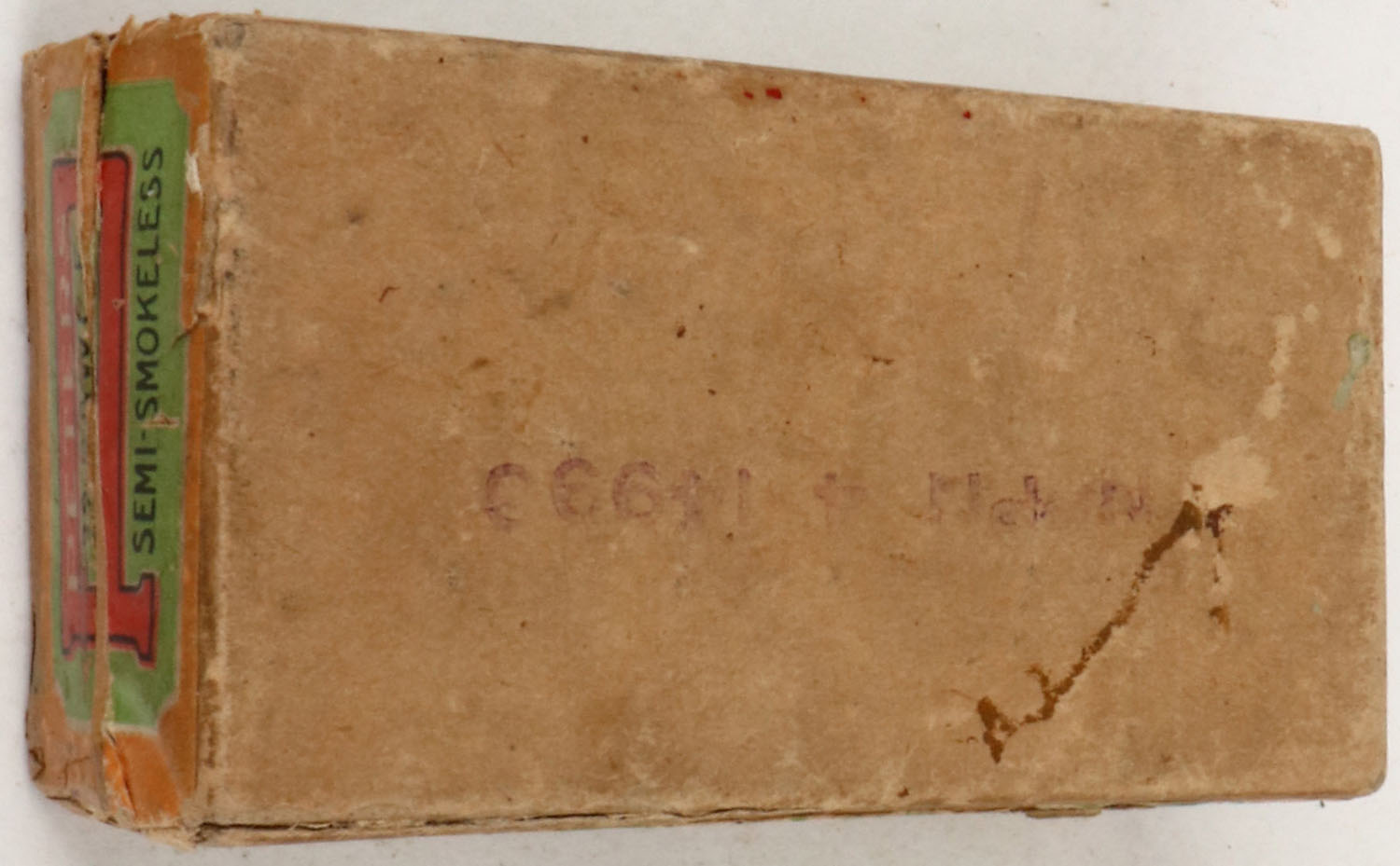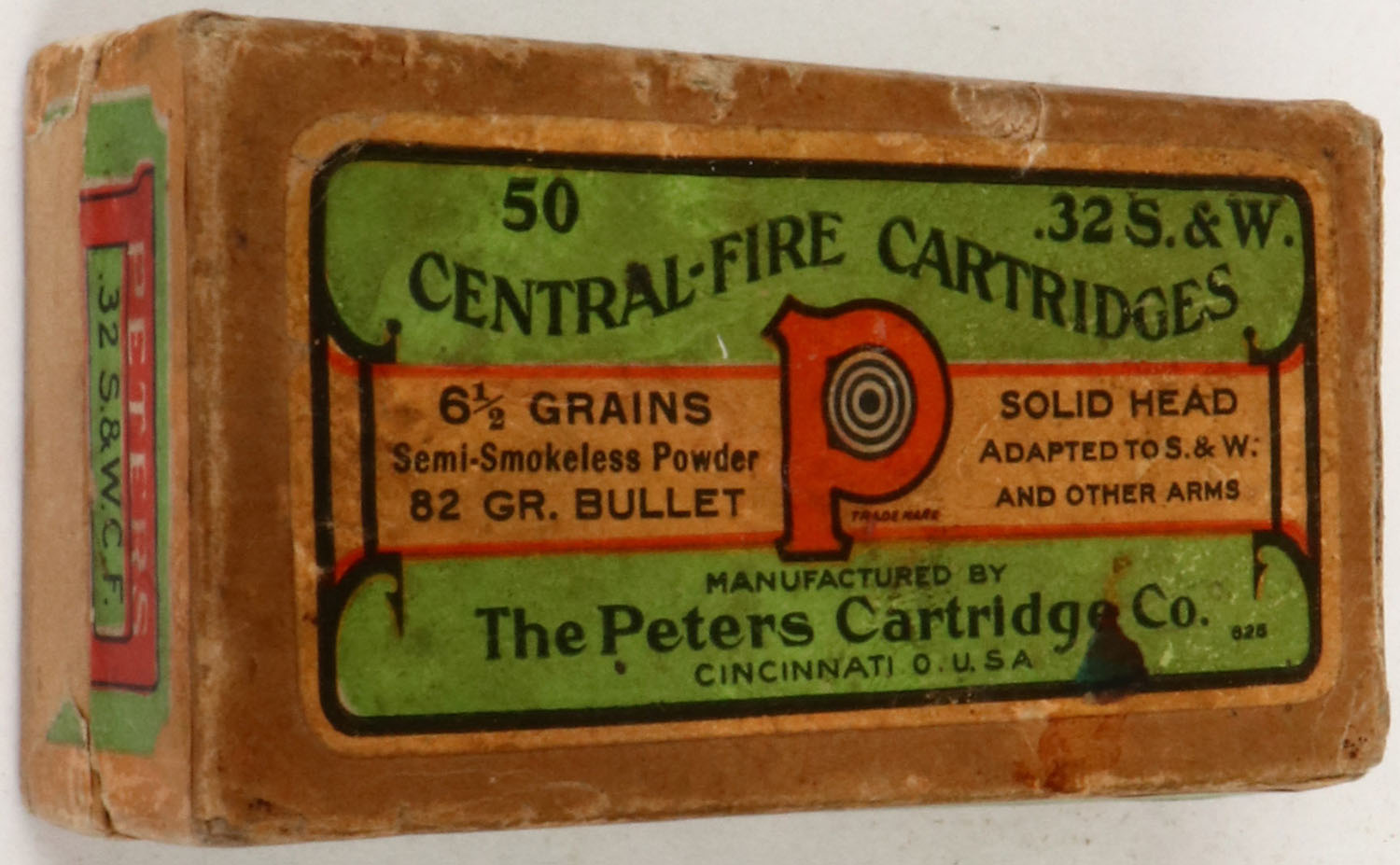 Peters, Central-Fire Cartridges, .32 S&W, 82 Gr. Bullet, Full, 2pc. Buff box with green top & side sealing labels, box is solid with excellent color, some age soiling, edge & corner wear, stain on top, labels are 90% intact, ammo is very good. Grade: Very Good ++ - Value: 20 to 60