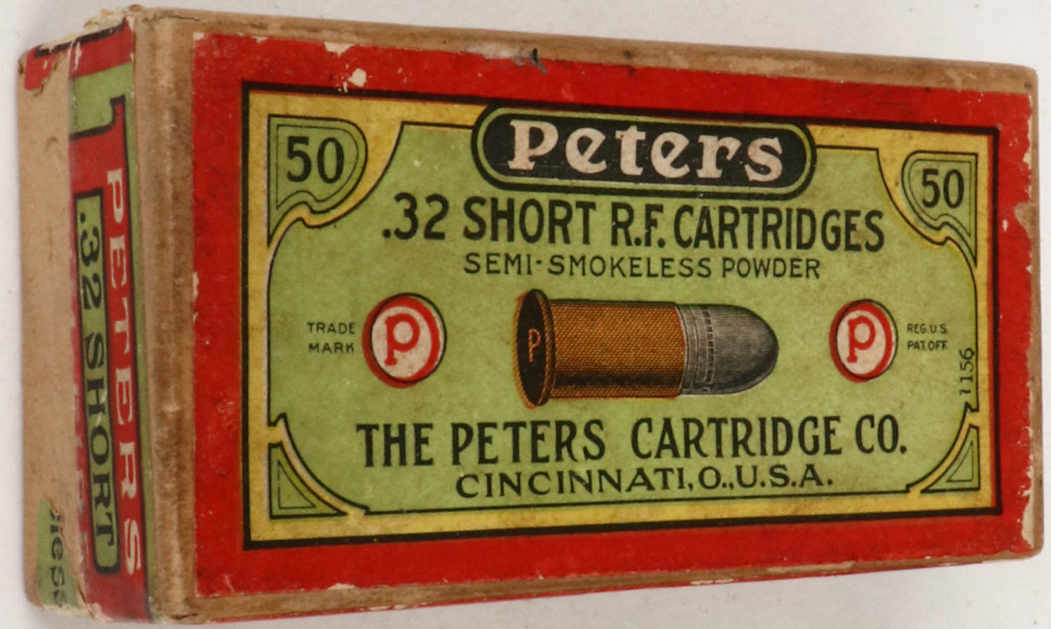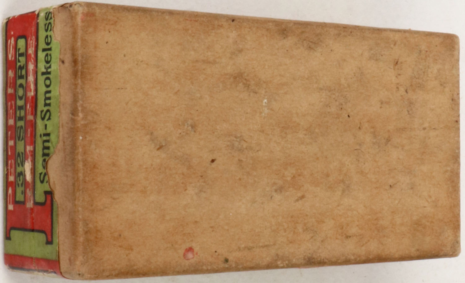 Peters, .32 Short Rim Fire, Semi-Smokeless Powder, Full, .2pc. Buff box with green ^ red top & side sealing labels, box is solid with excellent color, minor age soiling, very minor edge & corner wear, labels are 90% intact, ammo is very good. (348) Grade: Very Good ++ - Value: 50 to 150