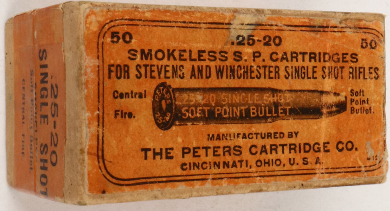 Peters, .25-20 Single Shot, Soft Point Bullet, FULL & SEALED, 2pc. Buff box with orange top & side sealing labels, box is solid with excellent color, minor age soiling, very minor shelf & corner wear, edges are mostly crisp, labels are intact. Grade: Excellent - Value: 100 to 300