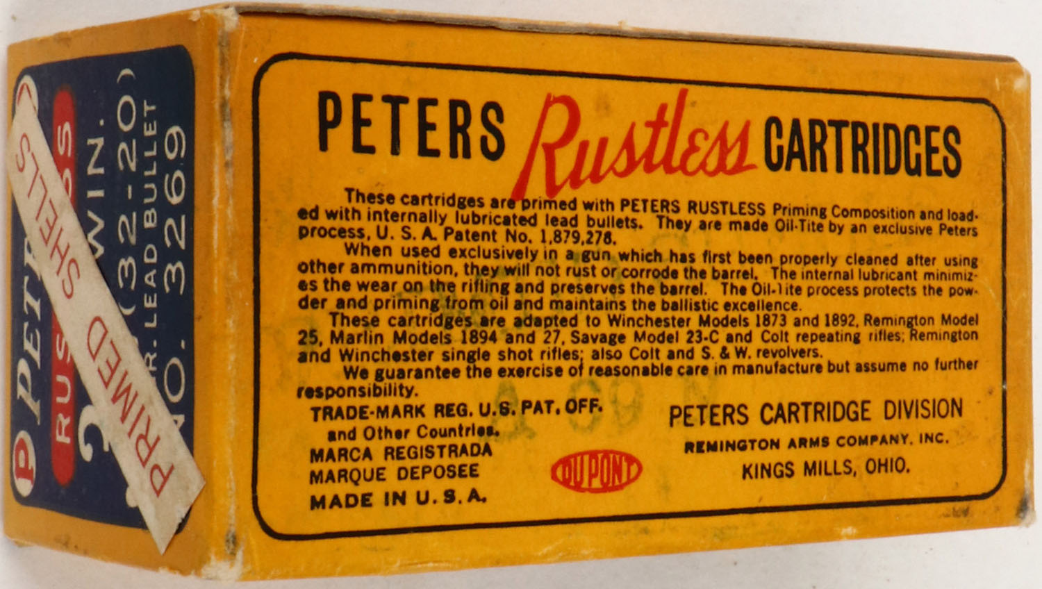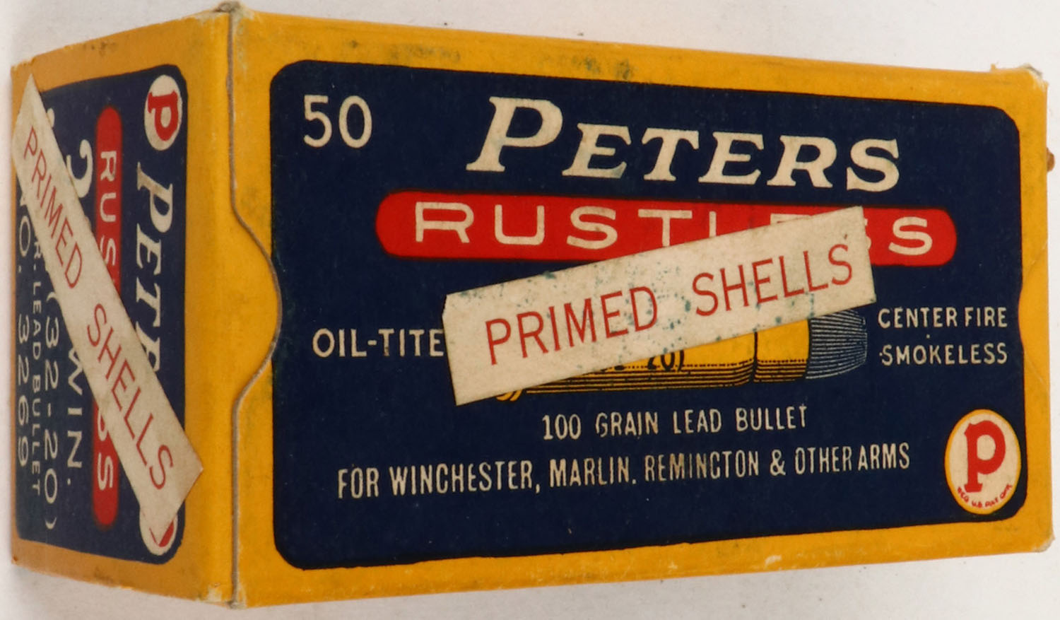 Peters, Rustless, .32-20 Primed Shells, Full, 1pc. Blue yellow & red box with white ''PRIMED SHELLS'' over label, box is solid with excellent color, only very minor age soiling & corner wear, edges are crisp, end flaps are solid, ammo is excellent. Grade: Excellent - Value: 20 to 60