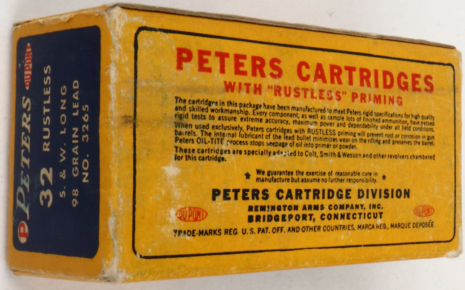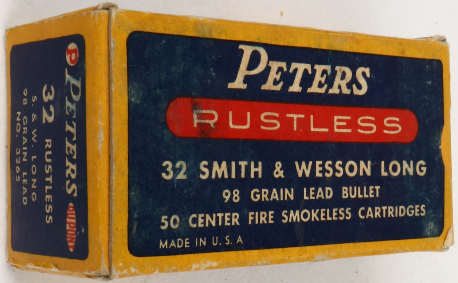 Peters, Rustless, .32 Smith & Wesson Long, 98 Grain Lead Bullet, Partial 49rds., 1pc. Blue & yellow & red box, box is solid with excellent color, very minor age soiling & shelf wear, very minor edge & corner wear, end flaps are solid, ammo is excellent. Grade: Excellent - Value: 10 to 50