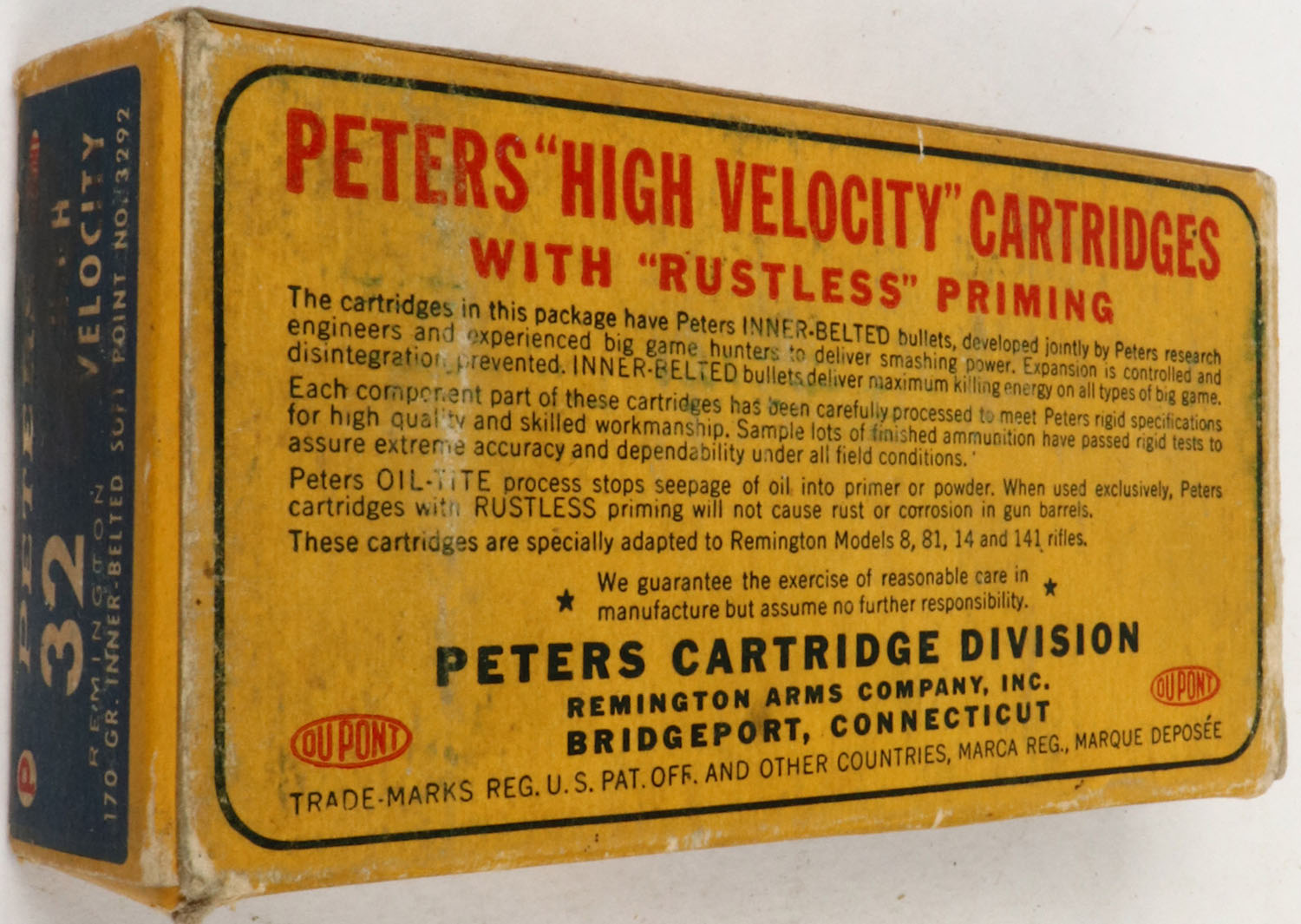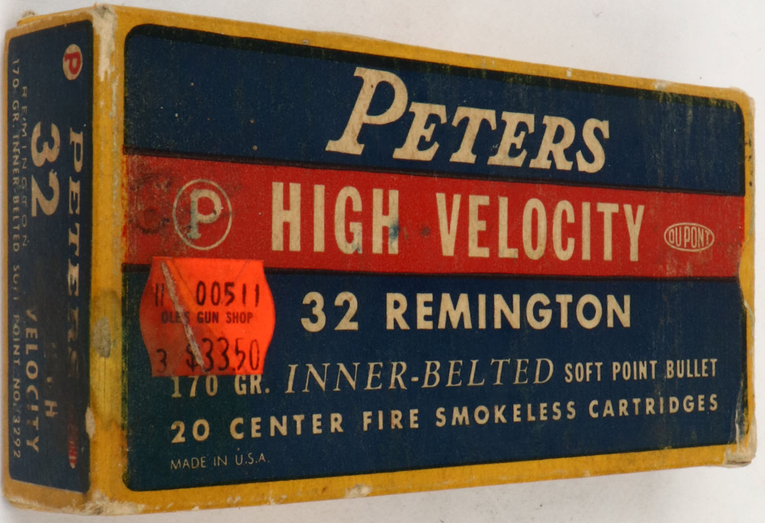 Peters, High Velocity, .32 Remington, 170 Gr. Inner-Belted Soft Point Bullet, Partial 19rds., 1pc. Blue yellow & red box, box is solid with very good color, minor age soiling, corner wear, edges are mostly crisp, end flaps are solid, ammo is excellent. Grade: Very Good ++ - Value: 20 to 60