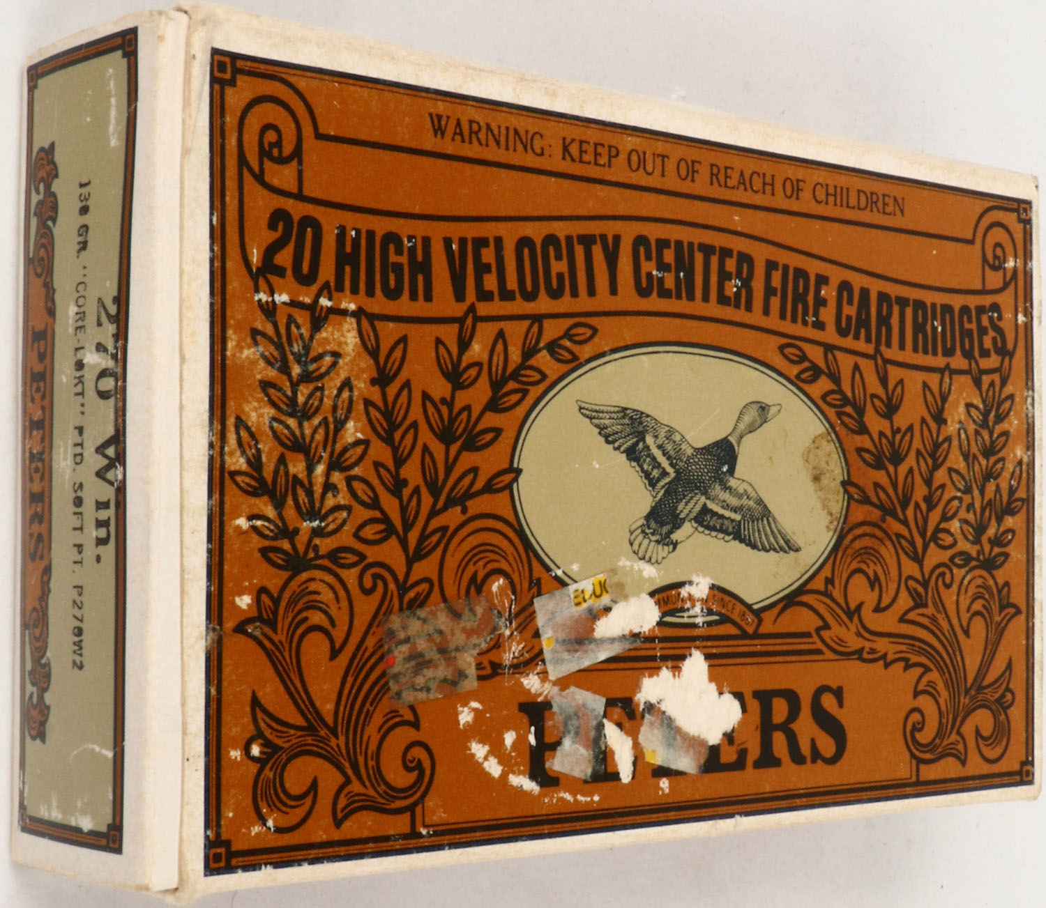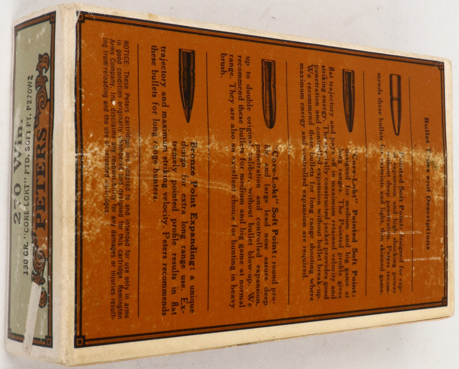 Peters, High Velocity, .270 Winchester, 130 Gr. Core-Lokt Ptd. Soft Pt., Partial 19rds. 1pc. Brown olive & white box, box is solid with excellent color, minor shelf wear, tape on top, very minor corner wear, edges are mostly crisp, end flaps are solid, ammo is excellent. Grade: Very Good ++ - Value: 10 to 40