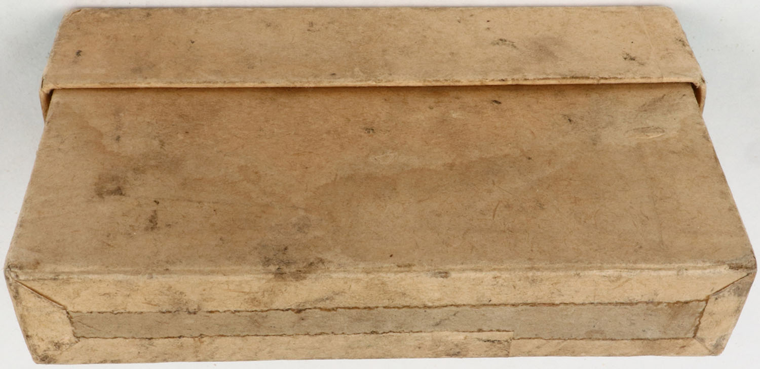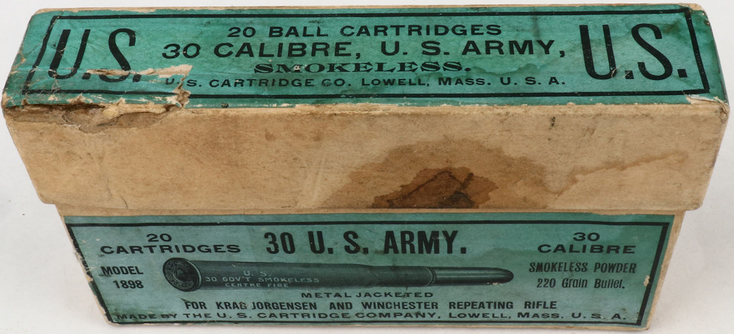 U.S. Cart. Co., .30 U.S. ARMY, Smokeless Powder, 220 Grain Metal Jacketed Bullet, Full of mixed H/S, 2pc. Buff box with green labels, box is solid with excellent color, some age soiling, stain to front, edge & corner wear, corner ding to top front corner, ammo is excellent. Grade: Very Good + - Value: 20 to 80