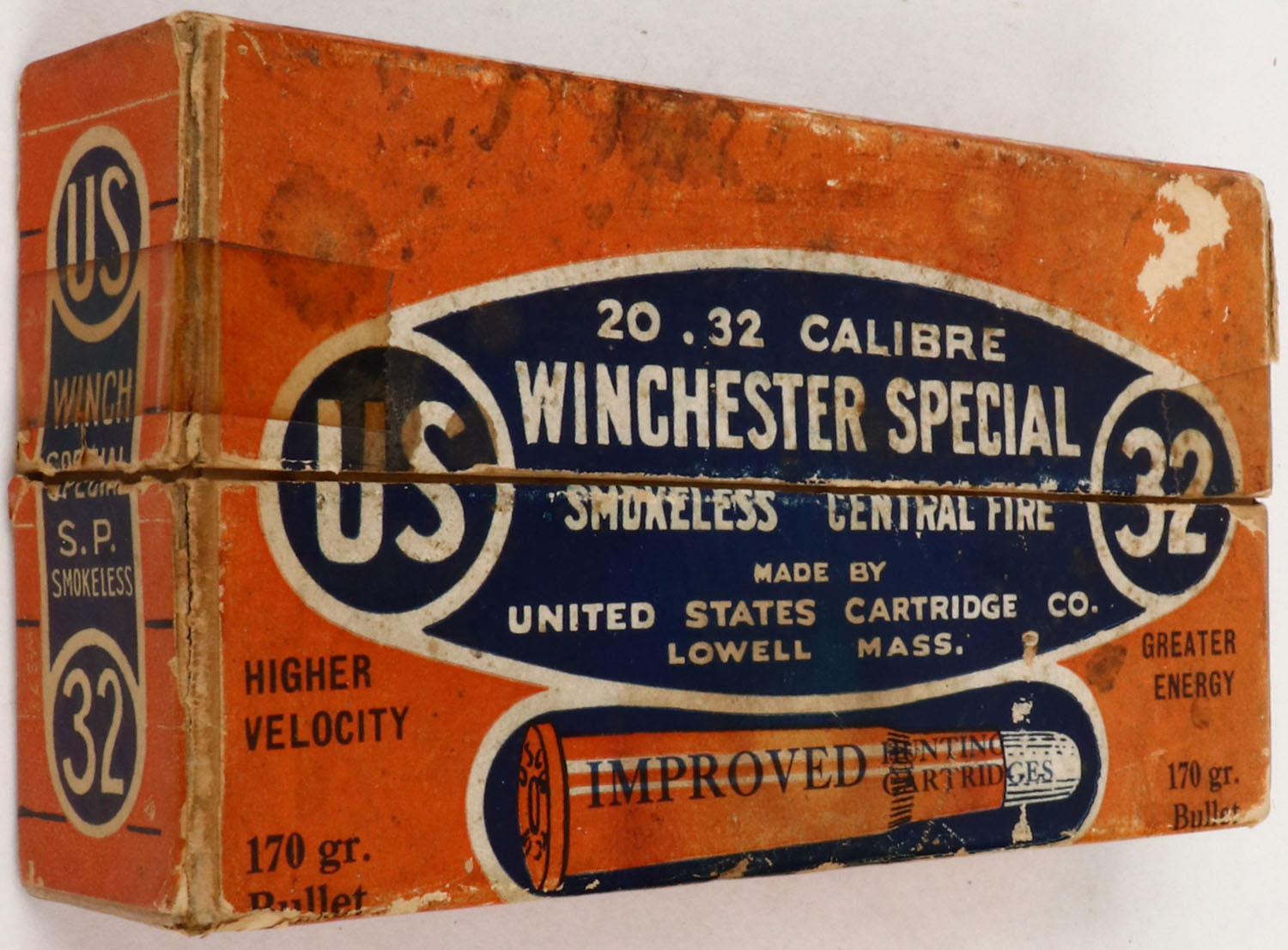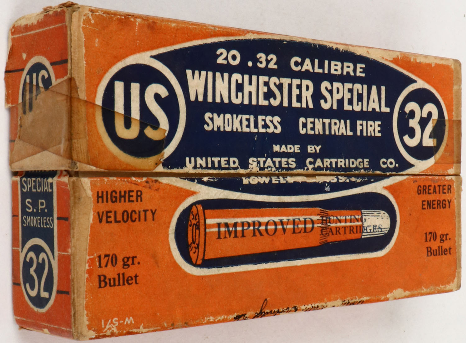 U.S. Cart. Co., Improved Hunting Cartridges, .32 Winchester Special, Partial 13rds., 2pc. Orange blue & white box, box is solid with very good to excellent color, minor age soiling, lid has taped seam splits, minor edge & corner wear, labels are 99% intact, ammo is excellent. Grade: Very Good - Value: 10 to 40