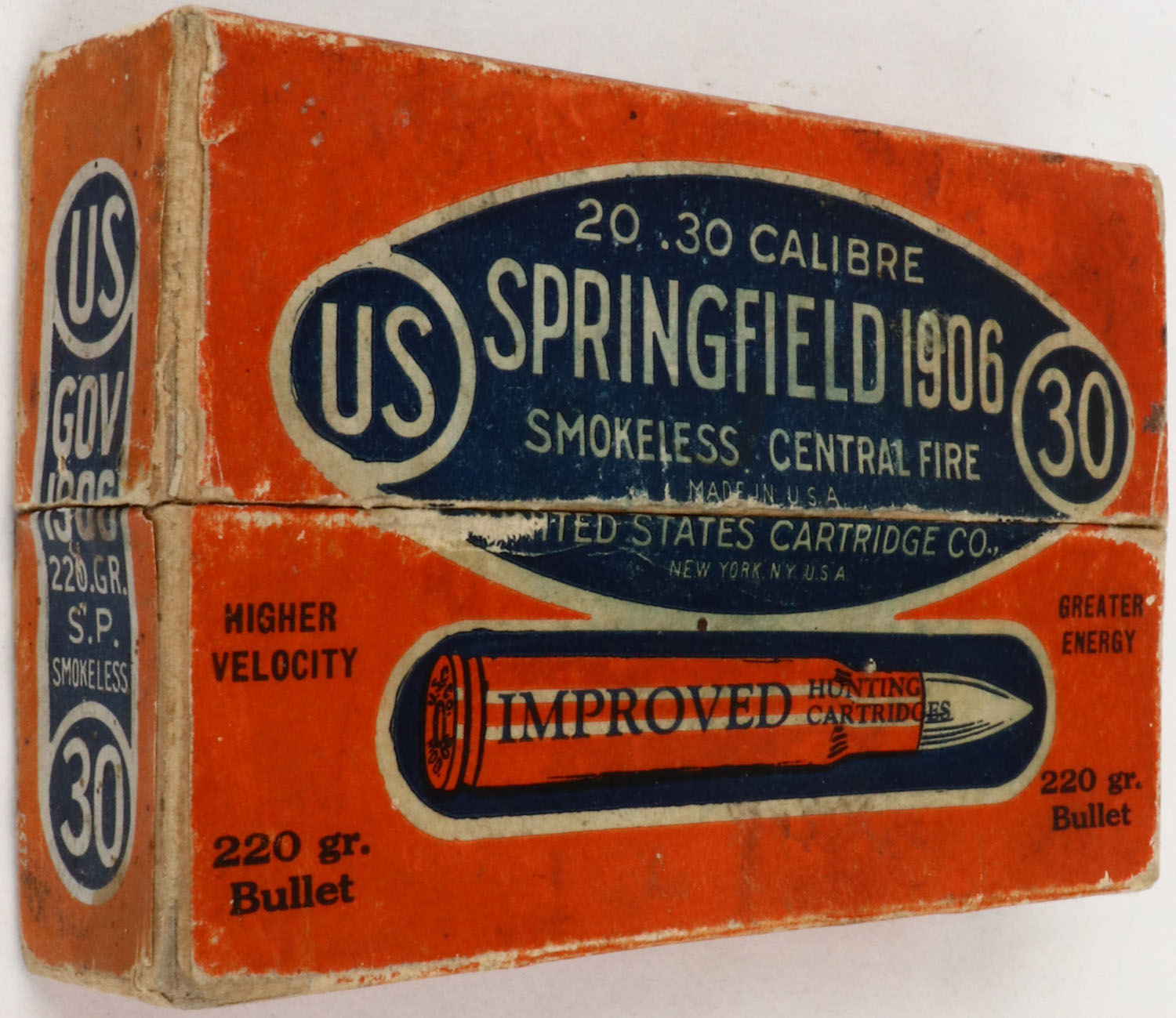 U.S. Cart. Co., .30 Springfield 1906 (.30-06), 220 Gr. Bullet, Partial 18rds. 2pc. Orange blue & white box, box is solid with excellent color, minor age soiling, edge & corner wear, partial seam split to front left edge, labels are intact, left end of lid has been written on, ammo is excellent. Grade: Very Good + - Value: 30 to 60